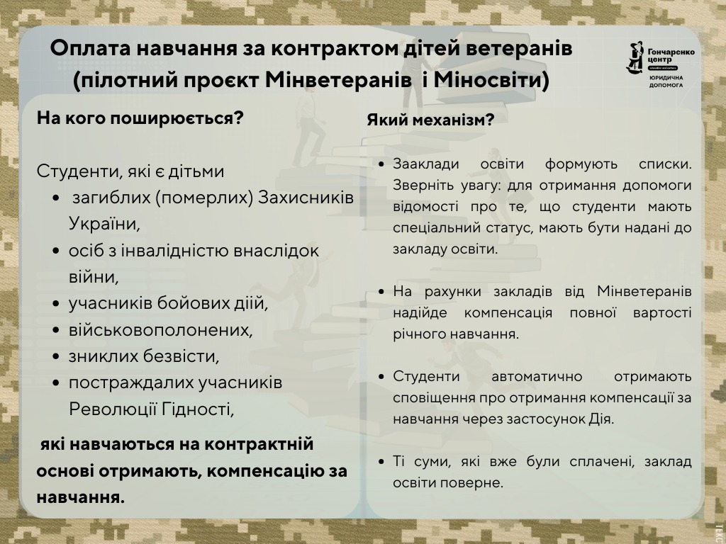 Студенти, які є дітьми загиблих (померлих) Захисників України, осіб з інвалідністю внаслідок війни, учасників бойових дій, військовополонених і зниклих безвісти, а також постраждалих учасників Революції Гідності, і які навчаються на контрактній основі, мають право на отримання компенсації за навчання.