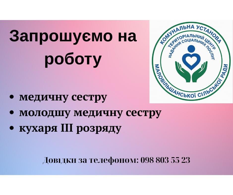 Комунальна установа «Територіальний центр надання соціальних послуг» Маловільшанської сільської ради активно шукає кваліфікованих фахівців для посилення своєї команди. Ми запрошуємо на роботу у відділення стаціонарного догляду постійного проживання, розташоване за адресою: село Озерна, вулиця Паркова, 1. Наші двері відкриті для таких спеціалістів, як медична сестра, молодша медична сестра та кухар III розряду. Це чудова можливість долучитися до команди, яка дбає про добробут та комфорт мешканців, надаючи якісні соціальні послуги. Робота в нашій установі передбачає відданість справі, професіоналізм та бажання допомагати іншим. Ми пропонуємо стабільні умови праці та можливість професійного розвитку. Якщо ви маєте відповідний досвід та бажання працювати в соціальній сфері, чекаємо на вас! Для отримання детальної інформації та з приводу співбесіди, будь ласка, телефонуйте за номером 098 803 55 23. Також ви можете звернутися безпосередньо до нашої установи за вказаною адресою: с. Озерна, вул. Паркова, 1. Не пропустіть шанс стати частиною нашої дружньої команди та зробити свій внесок у розвиток соціальної сфери громади. Приєднуйтесь до нас, щоб разом творити добрі справи!