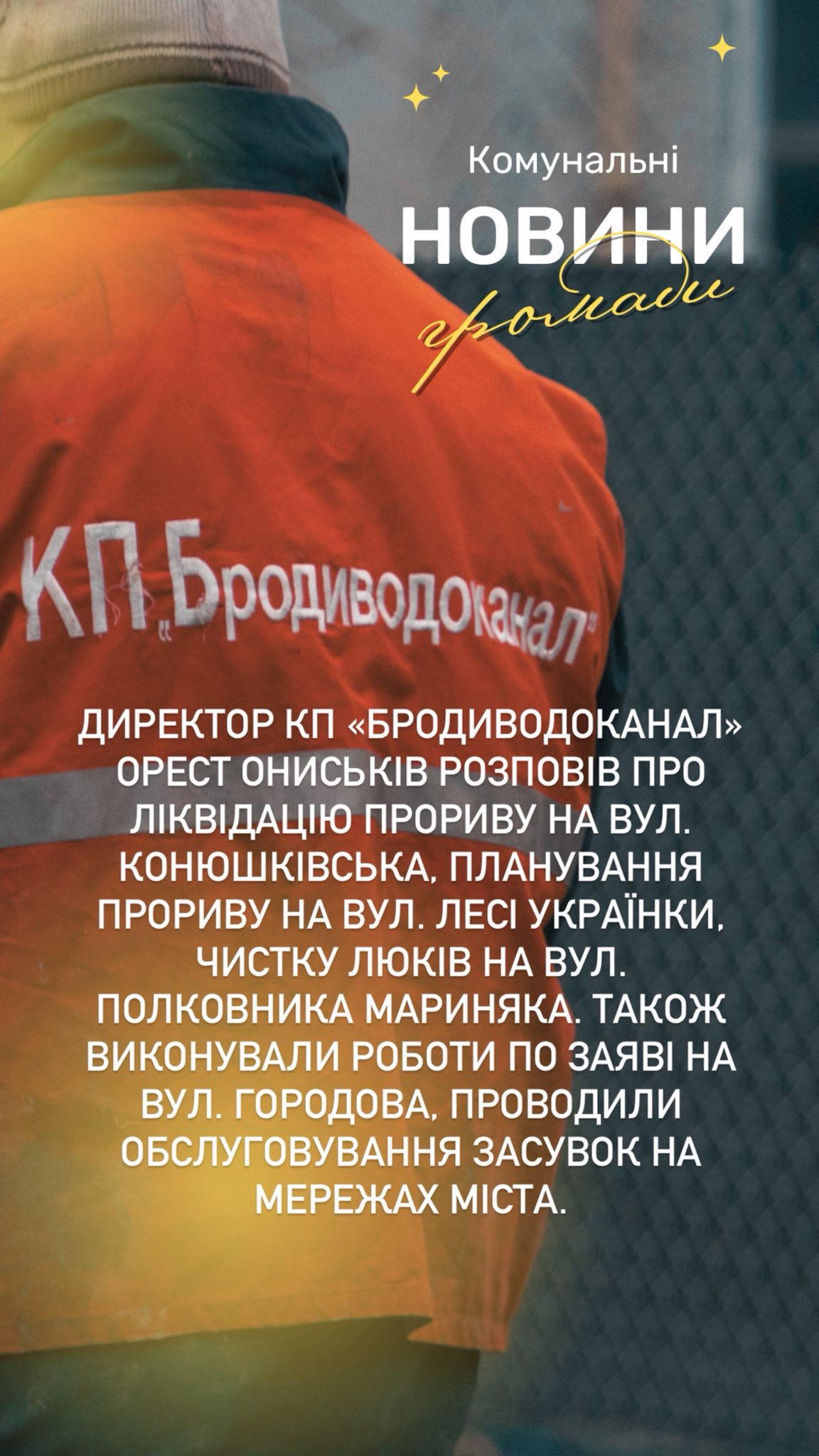 Директор КП «Бродиводоканал» Орест Ониськів розповів про оперативну ліквідацію прориву на вул. Конюшківська. Також заплановано усунення прориву на вул. Лесі Українки. Проводилася чистка люків на вул. Полковника Мариняка. Крім того, виконувалися роботи за заявою на вул. Городова та обслуговування засувок на мережах міста. Завдяки цим заходам забезпечується стабільне водопостачання та належне функціонування системи водовідведення.