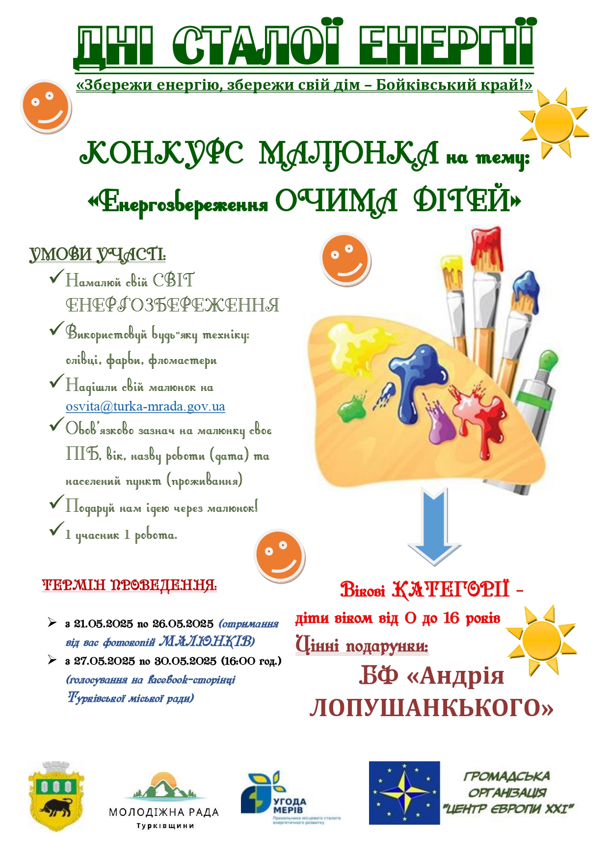 Запрошуємо юних талантів Турківської громади взяти участь у захопливому конкурсі дитячого малюнка «ЕНЕРГОЗБЕРЕЖЕННЯ очима дітей»! Цей конкурс присвячено Дням сталої енергії та має на меті привернути увагу до важливості заощадження енергії. Головний слоган конкурсу – «Збережи енергію, збережи свій дім – Бойківський край!», підкреслює зв’язок між нашими діями та майбутнім нашого регіону.