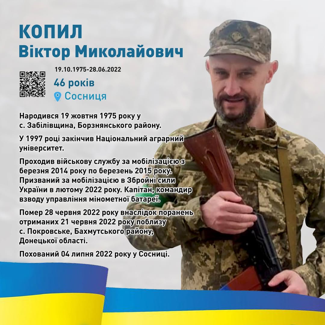 Вічна пам’ять і слава Герою, Віктору Копилу! Його ім’я навічно вписане в історію України як ім’я справжнього захисника, який віддав своє життя за рідну землю. Ми пам’ятаємо його подвиг і ніколи не забудемо.