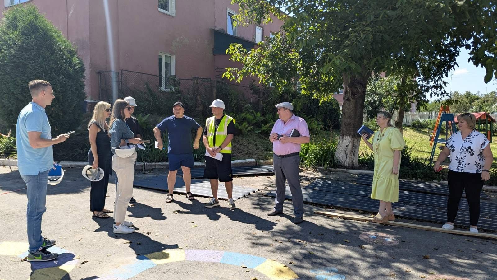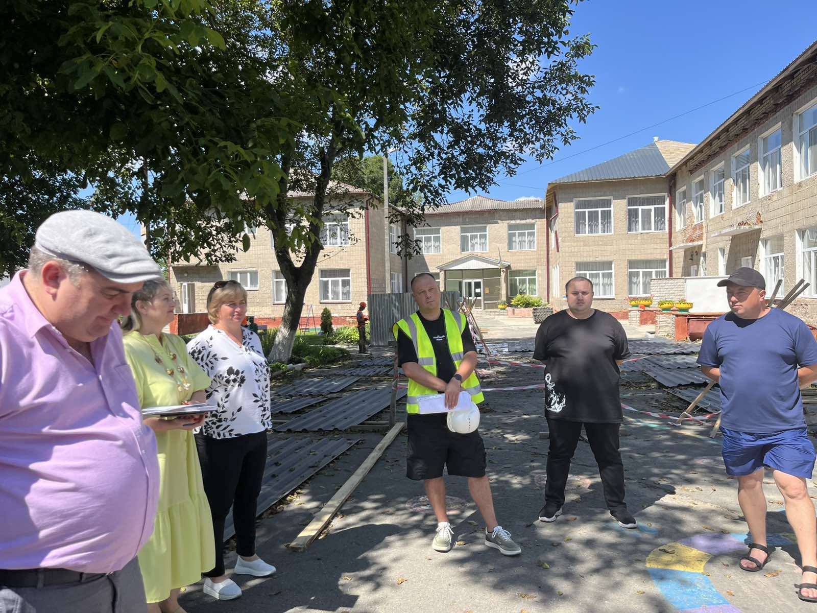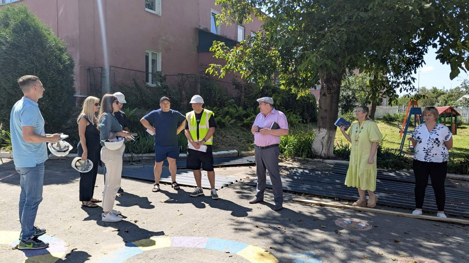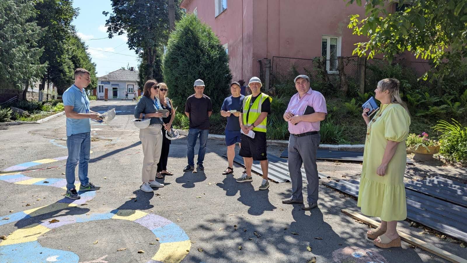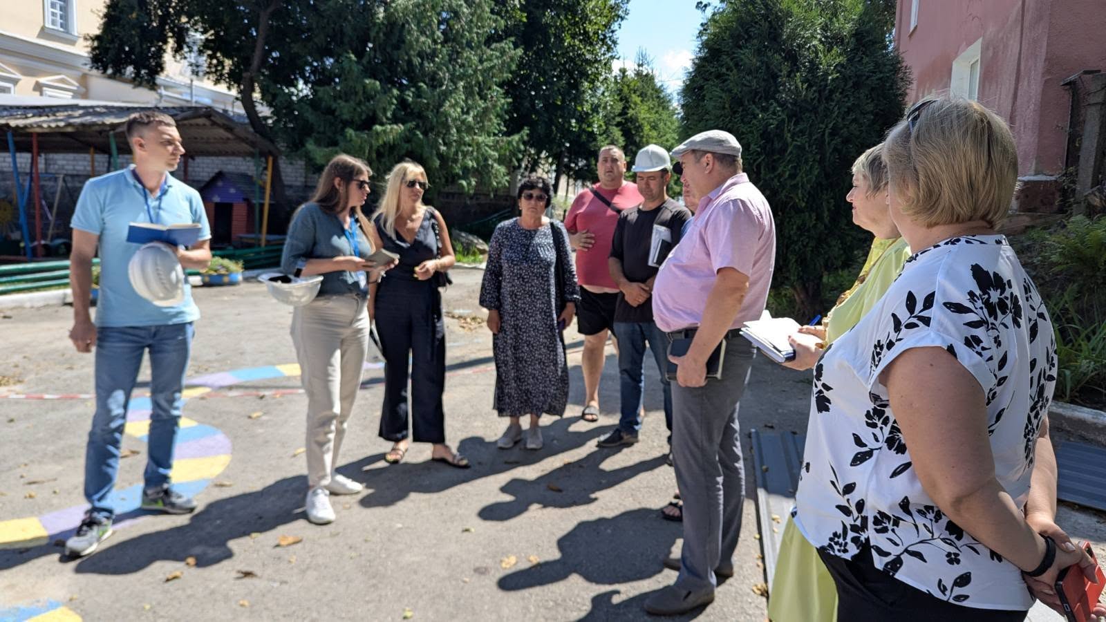 Міський голова Людмила Дмитрук разом із представниками міської ради, підрядною організацією та директором навчального закладу провела робочу зустріч із представниками ПРООН — Анастасією Криволаповою, Аліною Лєбєдєвою та Антоном Федюковичем — безпосередньо на об’єкті виконання робіт.