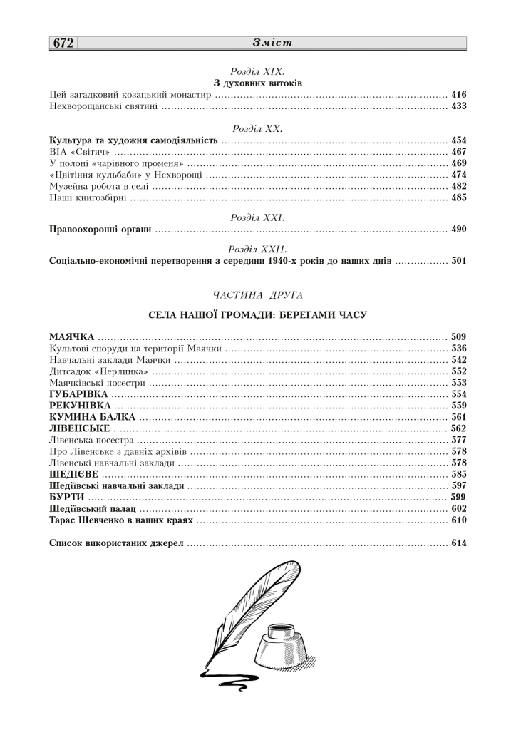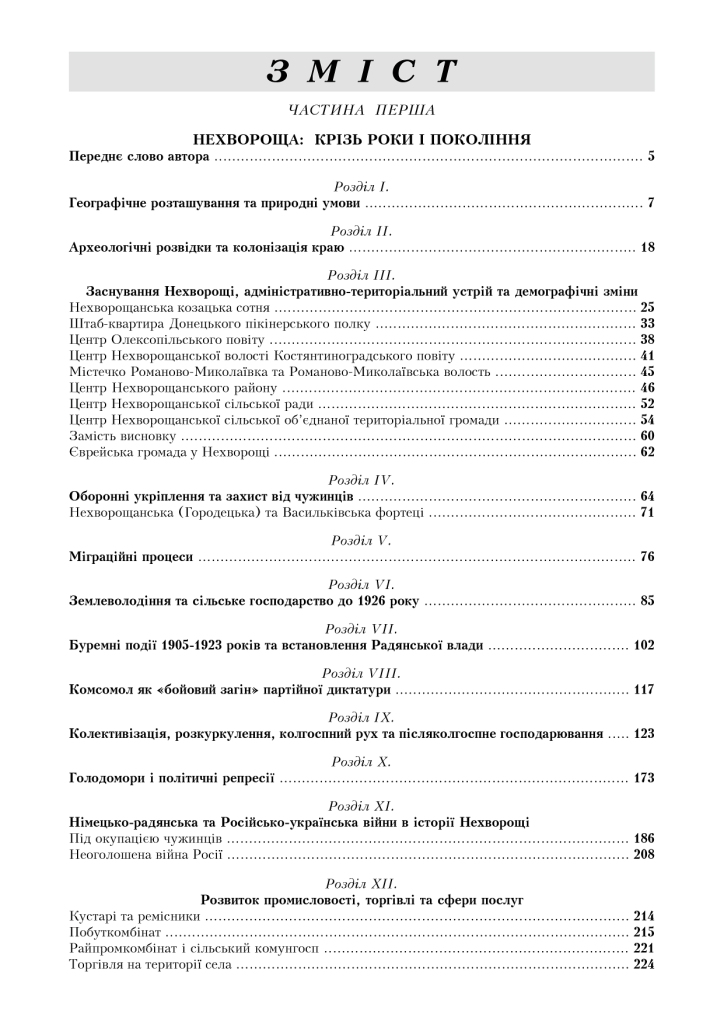 Перший том детально висвітлює історію Нехворощі від її заснування до наших днів, а також містить історії сіл Маячківського старостинського округу. Другий том присвячений історії сіл Соколовобалківського старостинського округу, доповнюючи його розповідями про видатних особистостей краю, архівними матеріалами, старовинними картами місцевості та найцікавішими публікаціями з районної газети «Прапор перемоги» (1932-1962 рр.).