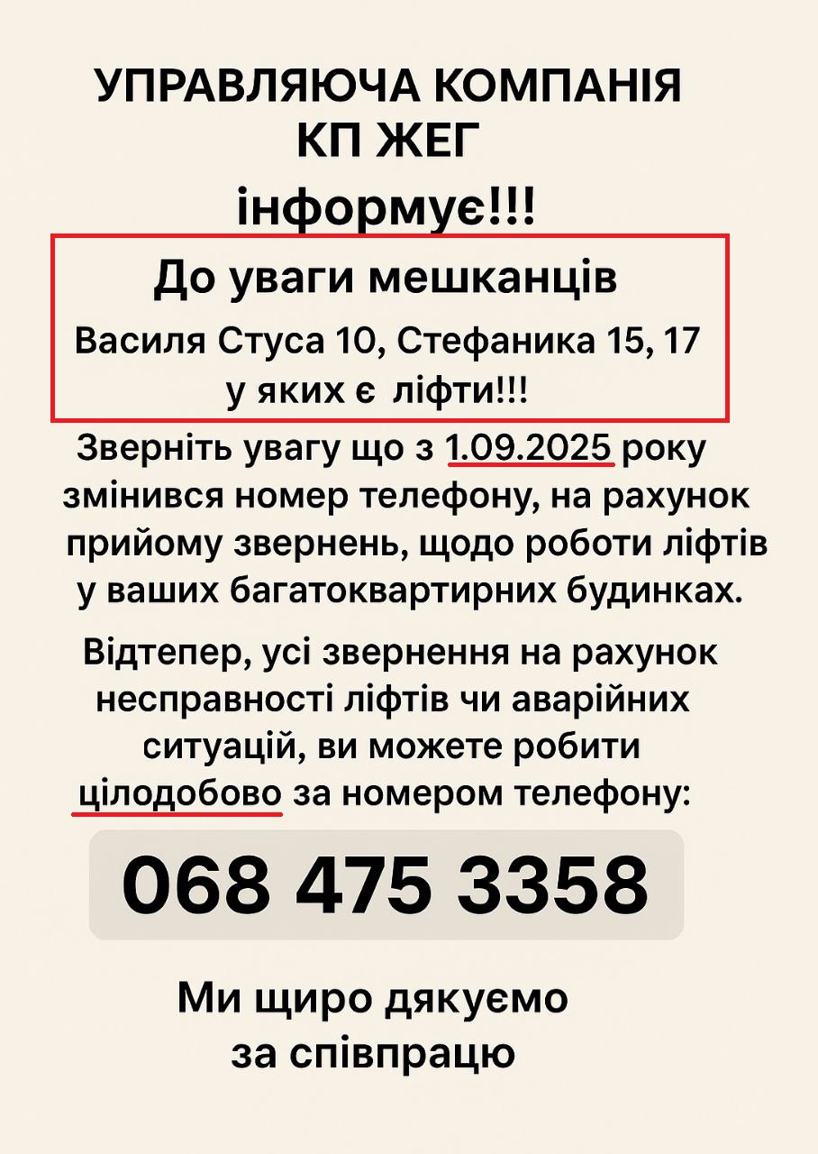 Керуюча компанія КП «ЖЕГ» звертає вашу увагу на зміни у роботі диспетчерської служби, що відповідає за обслуговування ліфтів.