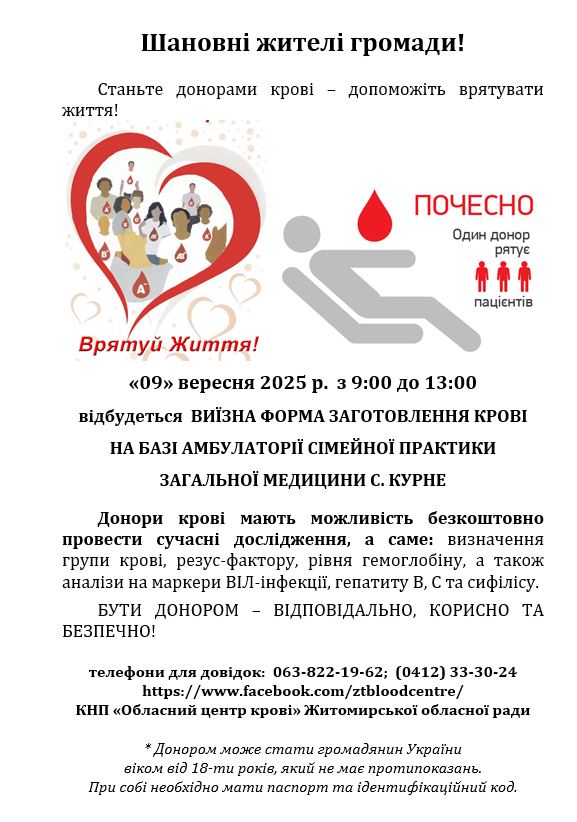 📅 9 вересня 2025 року, з 9:00 до 13:00, у селі Курне буде організовано виїзний пункт забору крові. Цей важливий захід відбудеться на базі місцевої амбулаторії сімейної практики загальної медицини. Ми запрошуємо всіх небайдужих жителів приєднатися до цієї акції.