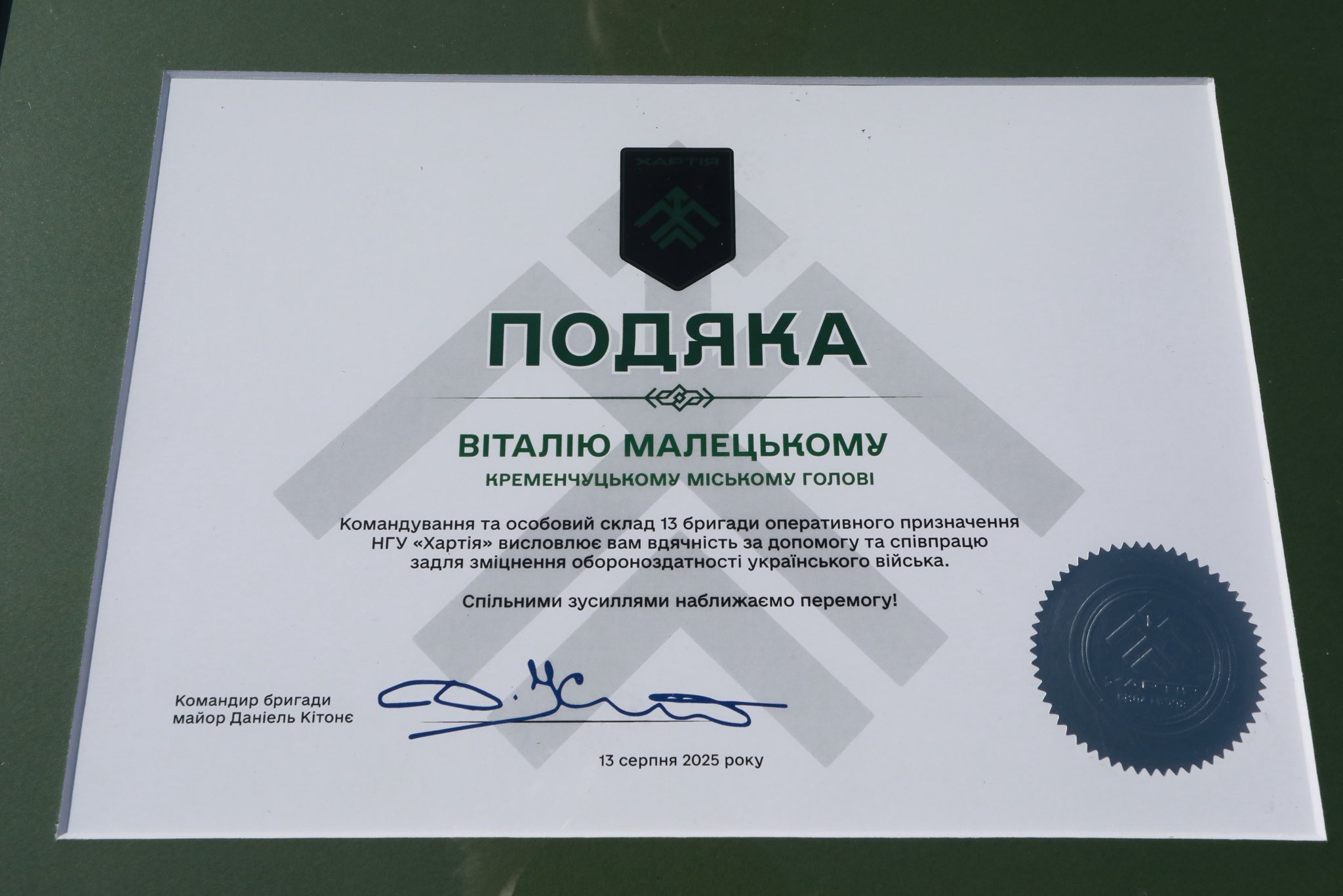 Цей комплекс допоможе нашим захисникам виявляти і знищувати ворога – як на землі, так і у небі! Дякую бійцям «Хартії» за службу, бажаю всім якнайшвидше повернутися до рідних домівок з Перемогою, живими і здоровими», — міський голова Віталій Малецький.