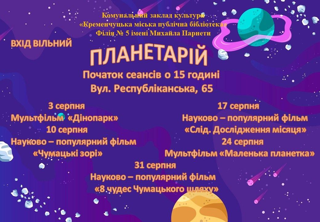 🪐 Кременчуцька міська публічна бібліотека запрошує дітей та батьків на пізнавальні зустрічі в межах програми «Літо під зорями». У планетарії показують науково-популярні фільми і мультфільми.