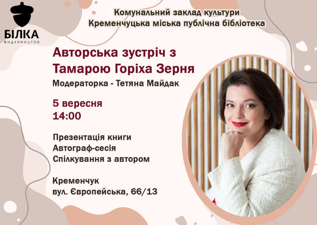 📚 Кременчуцька міська публічна бібліотека з радістю запрошує всіх шанувальників української літератури на унікальну зустріч з відомою письменницею Тамарою Горіха Зерня. Подія приурочена до презентації її нового захопливого роману «Шептуха».