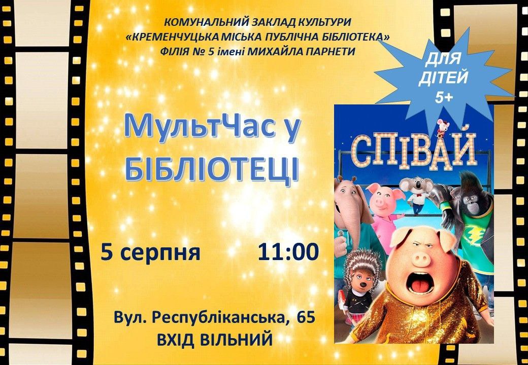 🍿 Кременчуцька міська публічна бібліотека запрошує дітей та батьків на перегляд мультфільму «Співай» у межах заходу «МультЧас у бібліотеці».
