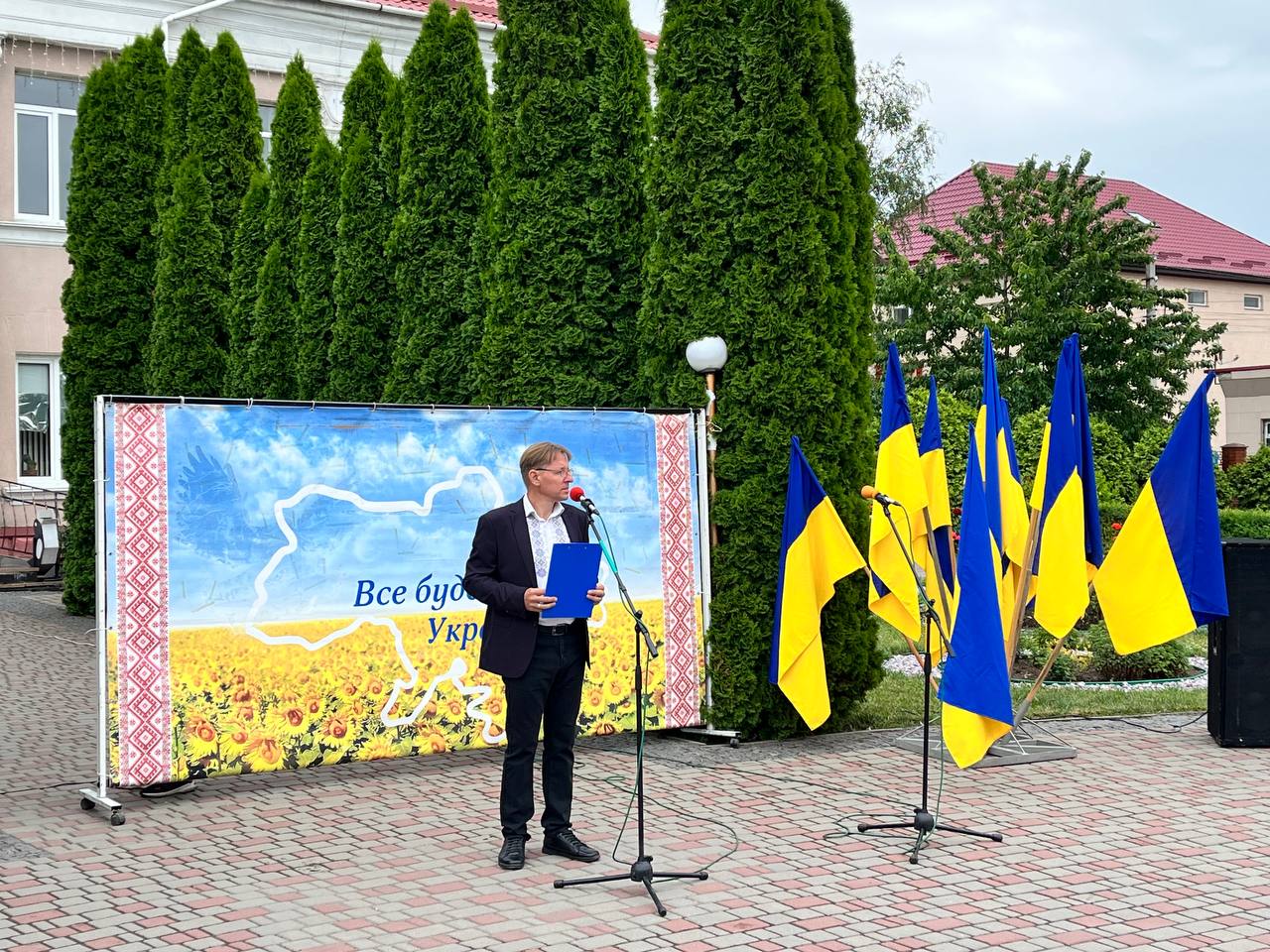 Виступаючи на заході, Крижопільський селищний голова Володимир ВАСИЛИШЕН Володимир Василишен – Крижопільський селищний голова зазначив, що День Конституції України – це День нашої волі, волі жити у демократичній та європейській державі, жити на своїй вільній українській землі. Саме ці цінності, жертвуючи власним життям, виборюють сьогодні наші мужні Воїни. Саме за це наші Герої платять своєю кров’ю та за те, щоб зупинити ворожі наміри не лише перекреслити нашу Конституцію, а й повністю знищити українську націю.