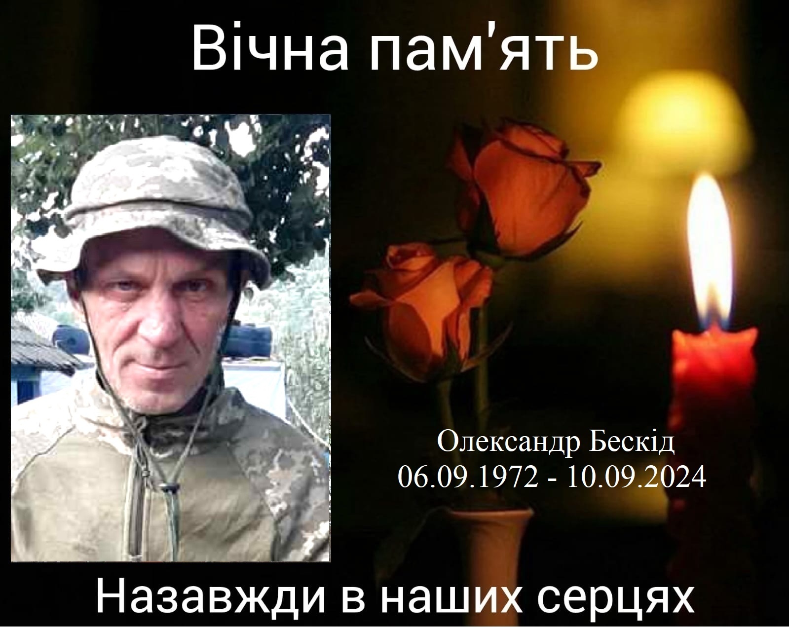 Солдат Олександр Бескід, 52 роки, загинув 10 вересня 2024 року поблизу Красногорівки, Покровського району Донецької області. Довгий час він вважався зниклим безвісти. Олександр Бескід був справжнім Героєм, який до останнього подиху захищав рідну землю.