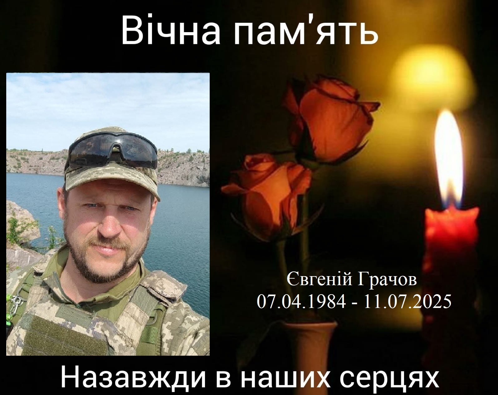 Сержант Євгеній Грачов, також 1984 року народження, пішов з життя 11 липня 2025 року внаслідок вибухової травми. Цю страшну травму він отримав, виконуючи бойове завдання на території Нововоронцовської громади Бериславського району Херсонської області. Його відвага перед обличчям ворога є прикладом для всіх нас.