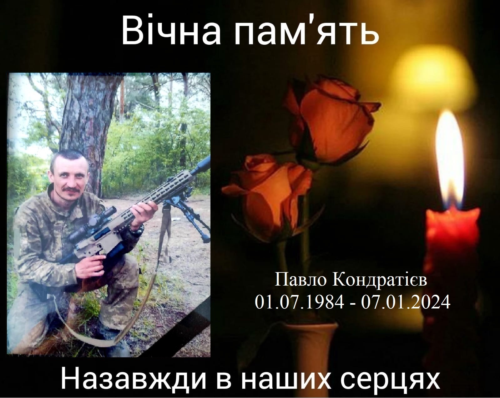 Солдат Павло Кондратієв, 1984 року народження, геройськи загинув 7 січня 2024 року під час виконання бойового завдання біля населеного пункту Вербове, що на Запоріжжі. Тривалий час його вважали зниклим безвісти, але тепер стало відомо про його героїчну загибель. Його мужність і самопожертва назавжди залишаться в наших серцях.