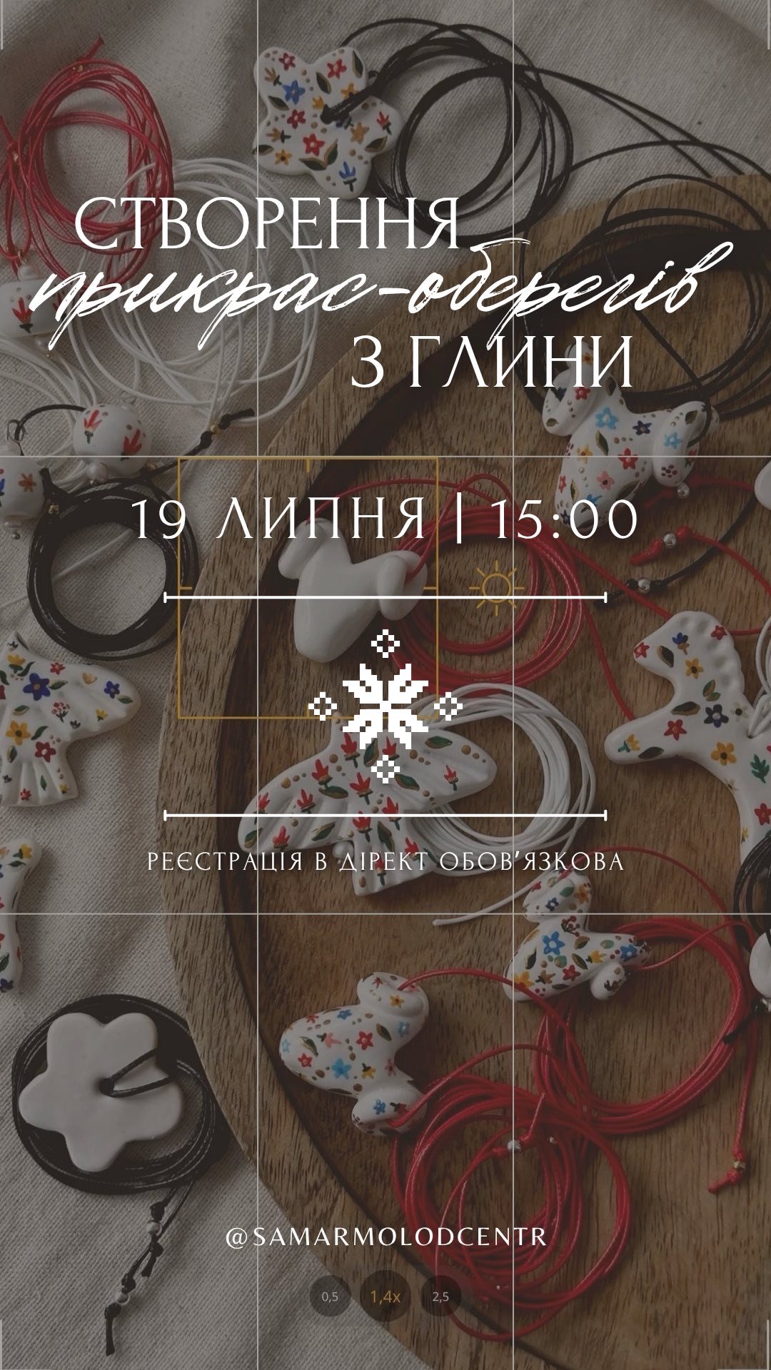 Творча майстерка, де учасники власноруч ліплять символічні прикраси з глини, натхненні українськими традиціями. Подія для молоді та всіх охочих, хто цікавиться народним мистецтвом і хоче створити власний оберіг. Це поєднання творчості, історії та самовираження через глину й символіку української культури.