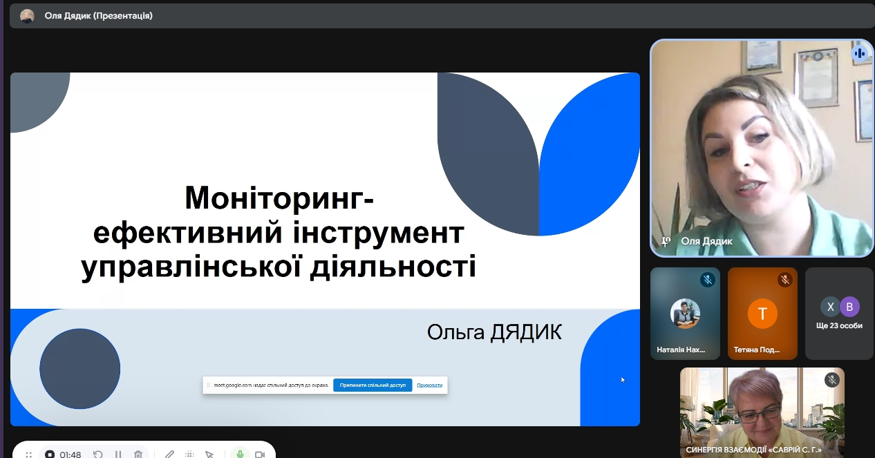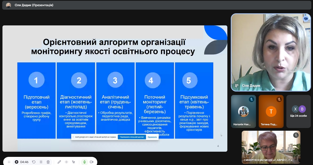 Під час виступу було детально розглянуто алгоритм організації моніторингу якості освітнього процесу. Ольга Дядик розповіла про те, як моніторинг допомагає закладу освіти підготуватися до інституційного аудиту та забезпечити високу якість освіти. Все було представлено конкретно, наочно, практично та зрозуміло для слухачів курсів. Прозорість та інформаційна відкритість Голосківського ліцею є прикладом дотримання статті 30 Закону України «Про освіту». Висловлюємо щиру подяку Ользі Анатоліївні Дядик за її досвід управлінської майстерності.