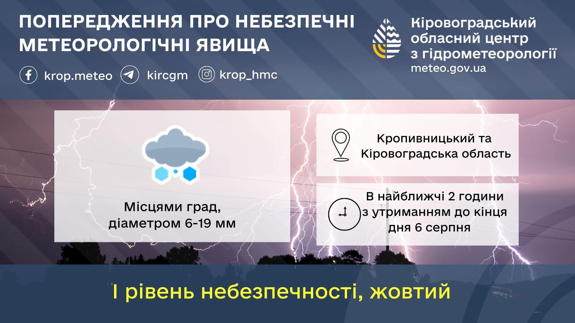 ⛈В найближчі 2 години з утриманням до кінця дня 6 серпня очікується місцями град, діаметром 6-19 мм.