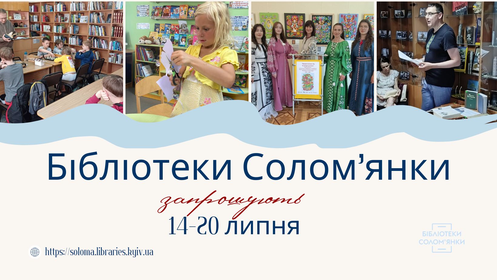 🌞 Липневе літо в Публічні бібліотеки Солом’янки – це більше, ніж просто відпочинок із книгою. Це час творчості, пізнання, мистецтва і спілкування. Наші простори наповнені кольорами виставок, ритмами української мови, енергією дитячих клубів, інтелектуальних вікторин та рукодільних майстерень.