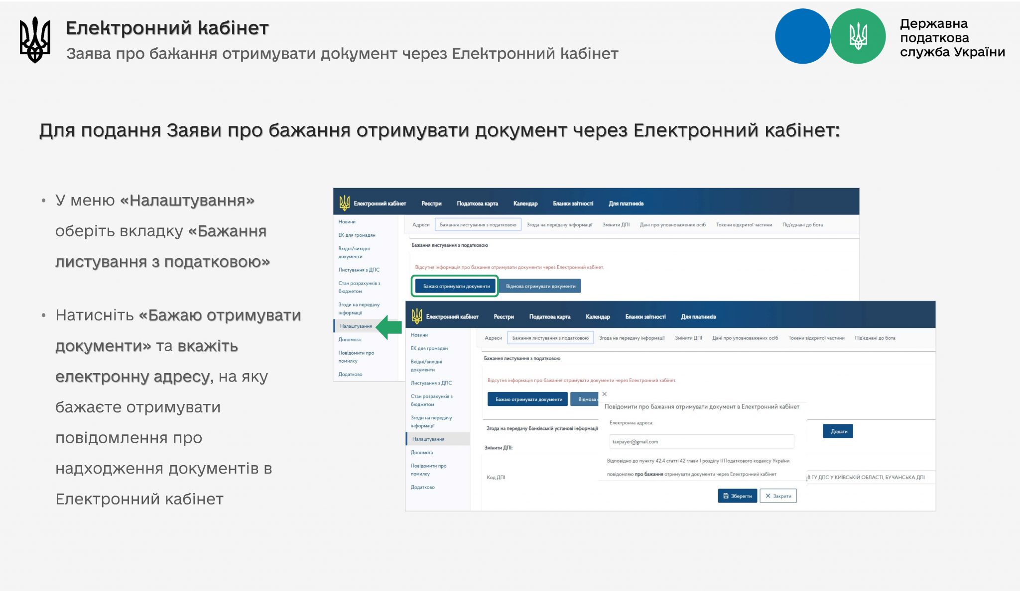 Відповідно до пункту 18 Порядку функціонування Електронного кабінету затвердженого наказом Міністерства фінансів України від 14.07.2017 № 637, зареєстрованого в Міністерстві юстиції України від 01 серпня 2017 за № 942/30810, зі змінами (далі – Порядок) листування контролюючих органів з платниками податків, які подають звітність в електронній формі у встановленому законодавством порядку та/або пройшли електронну ідентифікацію онлайн в Електронному кабінеті, здійснюється в електронній формі за умови подання Заяви про бажання отримувати документ через Електронний кабінет (далі – Заява) за формою згідно з додатком 3 до Порядку.