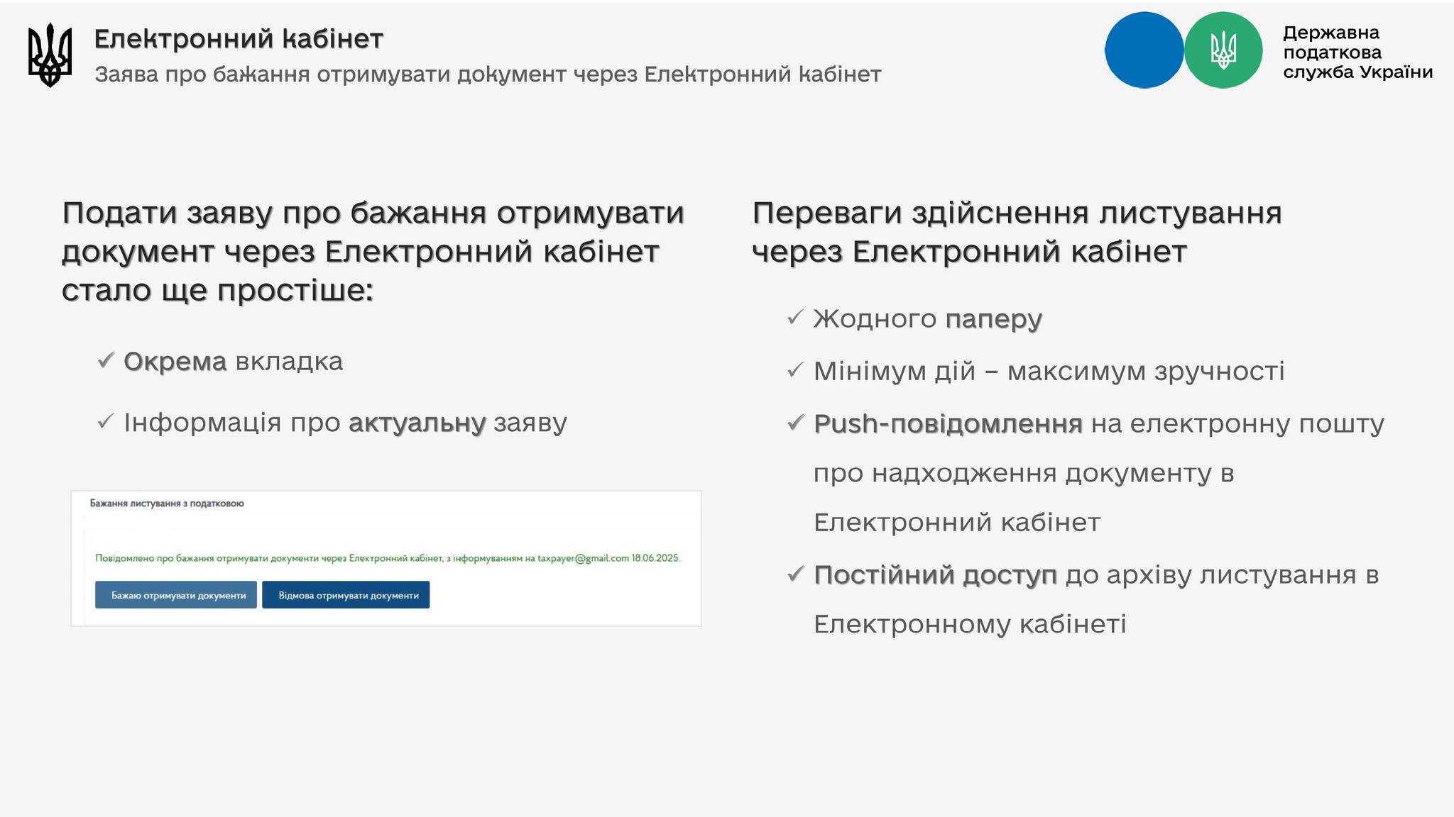 З метою підвищення ефективності інформаційної взаємодії з контролюючими органами, звертаємо увагу на можливість здійснення листування в електронному вигляді через Електронний кабінет, відповідно до пункту 42.4 статті 42 Податкового кодексу України(далі – Кодекс).