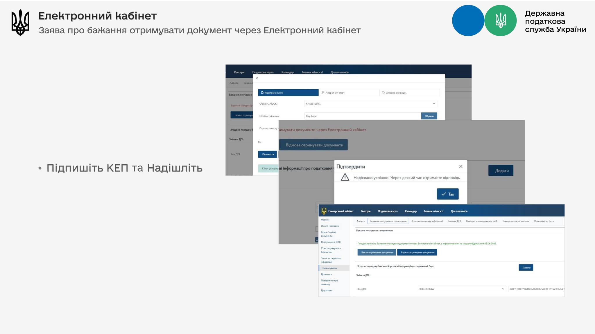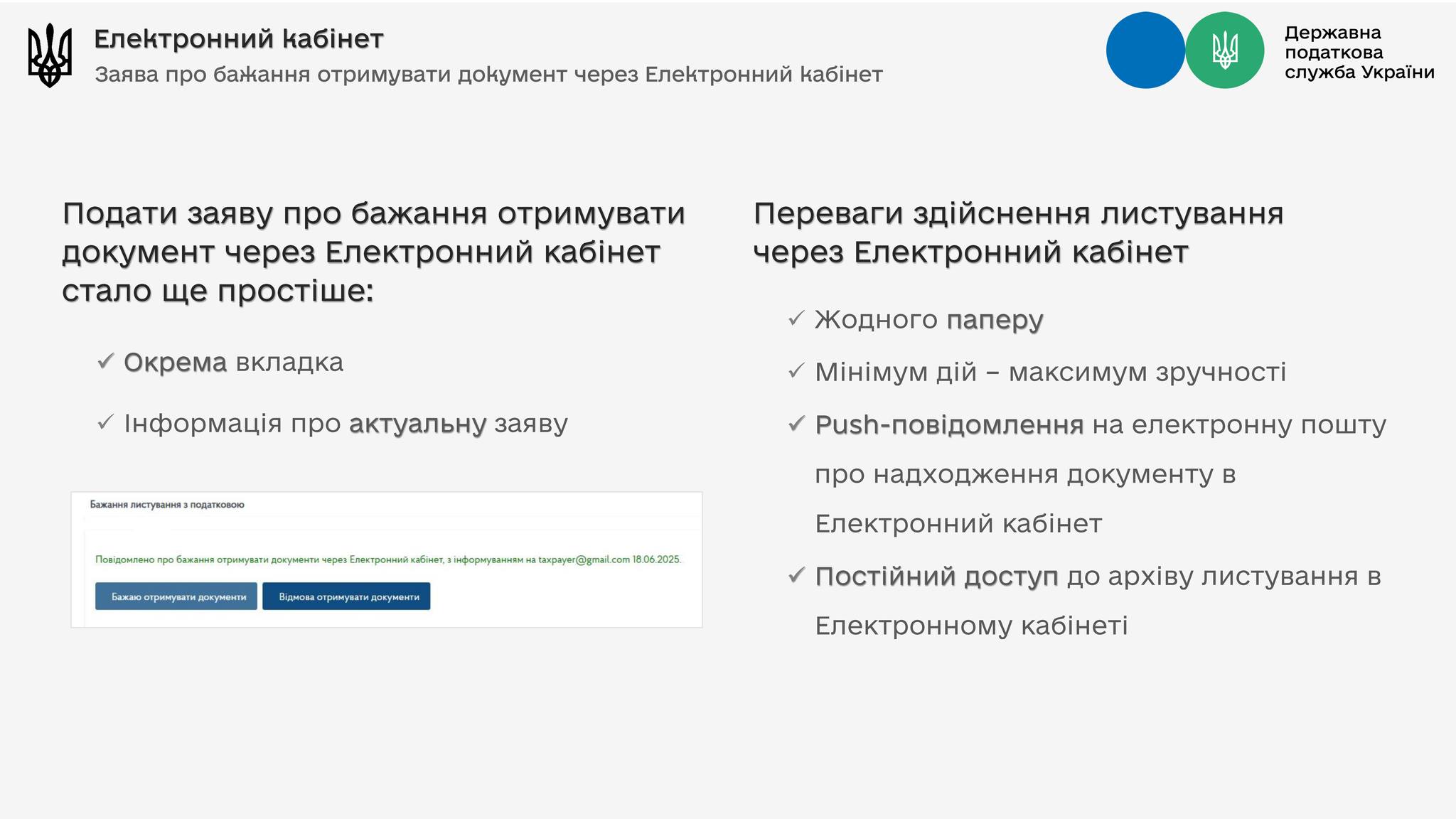 Відповідно до пункту 18 Порядку функціонування Електронного кабінету затвердженого наказом Міністерства фінансів України від 14.07.2017 № 637, зареєстрованого в Міністерстві юстиції України від 01 серпня 2017 за № 942/30810, зі змінами (далі – Порядок) листування контролюючих органів з платниками податків, які подають звітність в електронній формі у встановленому законодавством порядку та/або пройшли електронну ідентифікацію онлайн в Електронному кабінеті, здійснюється в електронній формі за умови подання Заяви про бажання отримувати документ через Електронний кабінет (далі – Заява) за формою згідно з додатком 3 до Порядку.