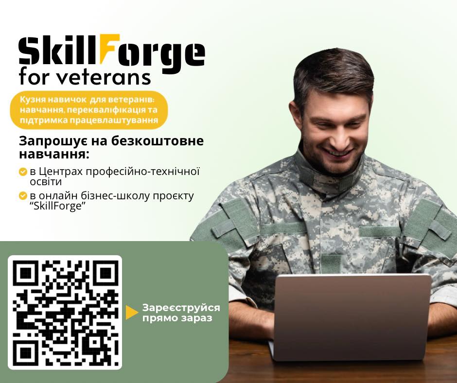 Львівський обласний центр зайнятості. інформує проте, що відкрита реєстрація на навчання для ветеранів та членів їхніх родин у межах проєкту “SkillForge для ветеранів”.