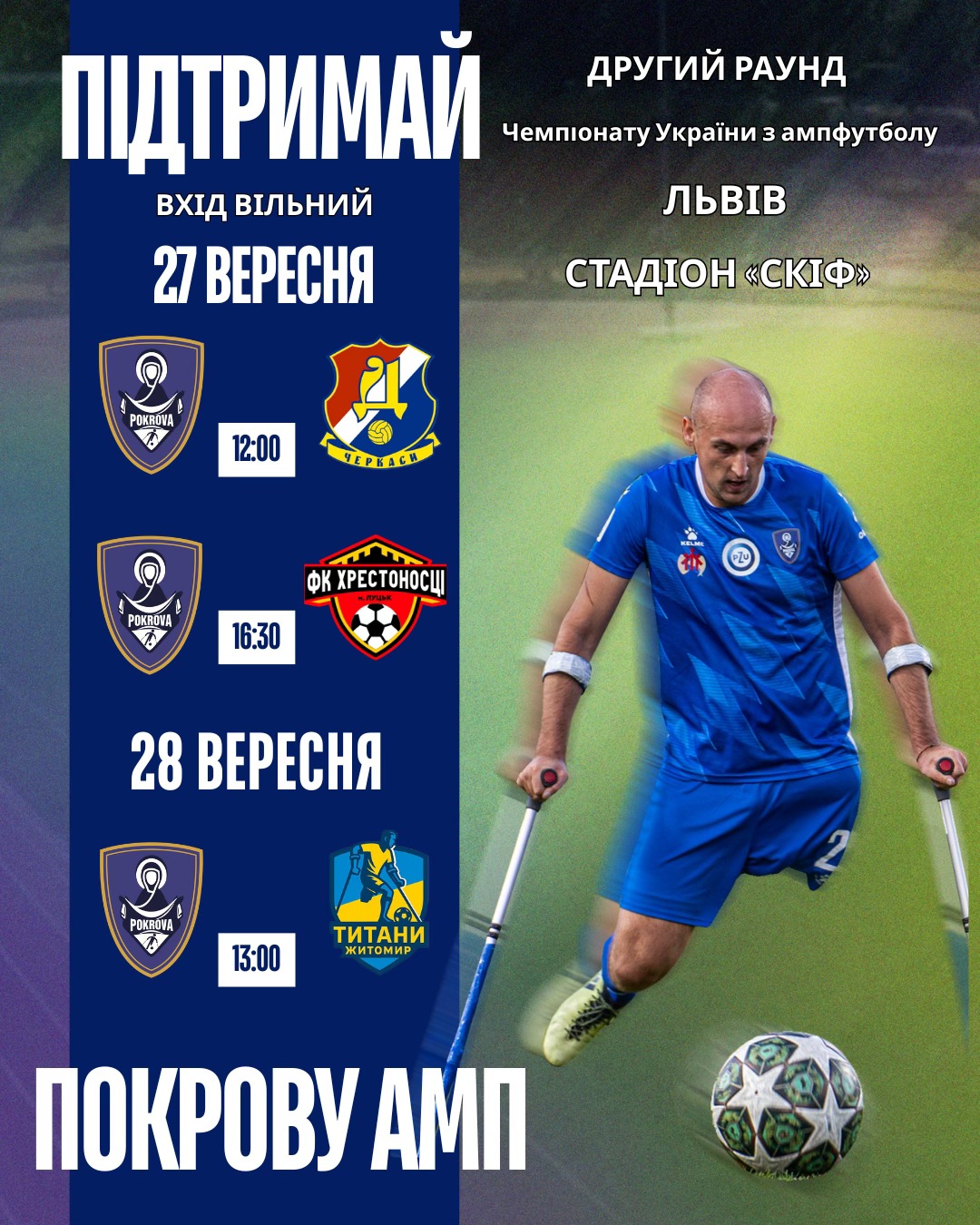 📌 Запрошуємо вас 27 та 28 вересня на стадіон «СКІФ» у Львові, щоб підтримати нашу незламну команду «Покрова АМП» у другому раунді чемпіонату України з ампфутболу. Ваша підтримка є надзвичайно важливою для наших героїв!