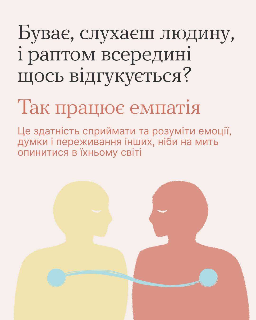 Такий собі додатковий ключ для комунікації, рівень емпатії у всіх різний. Але є способи її розвивати — вони в каруселі і на платформі «Ти як?»: http://howareu.com/materials/empatiia-iak-kliuch-do-zdorovykh-vidnosyn?utm_source=facebook&utm_medium=post&utm_campaign=product_sm