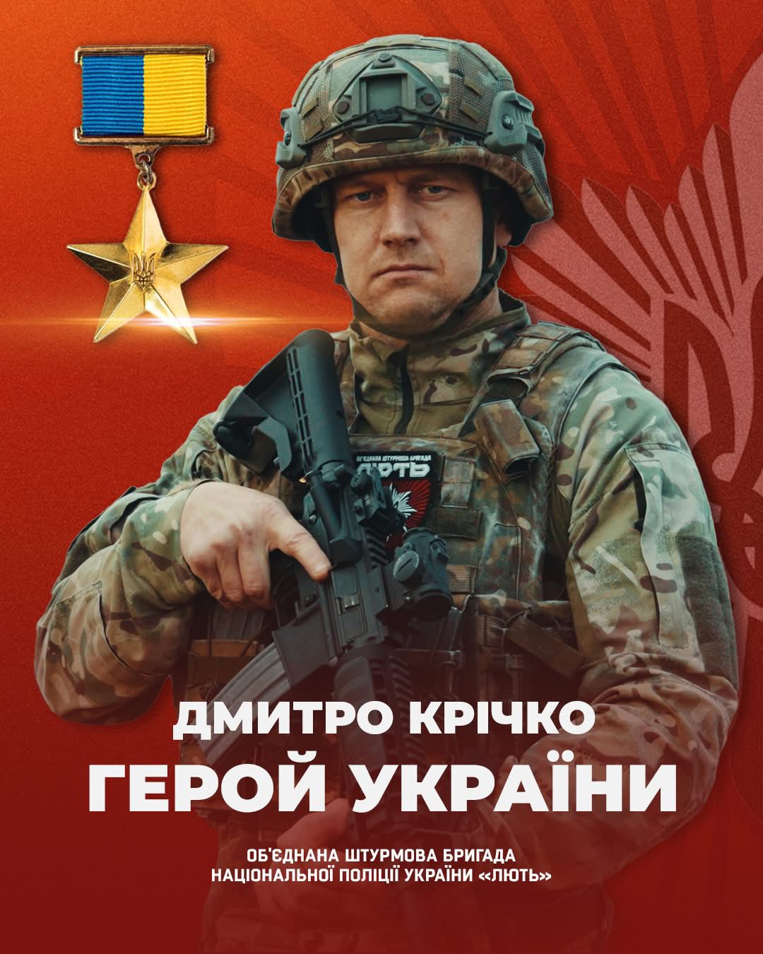 Указом Президента України сержанту поліції Дмитру Крічку — бійцю Об’єднаної штурмової бригади Національної поліції України «Лють» — присвоєно найвищу державну нагороду — звання Героя України з врученням ордена «Золота Зірка».