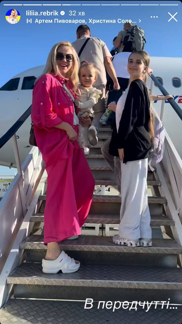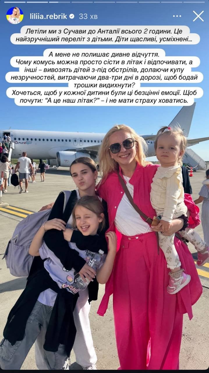 “Летіли ми з Сучави до Анталії всього дві години. Це найзручніший переліт з дітьми. Діти щасливі, усміхнені… А мене не полишає дивне відчуття. Чому комусь можна просто сісти в літак і відпочивати, а інші – вивозять дітей з-під обстрілів, долаючи купу незручностей, витрачаючи два-три дні в дорозі, щоб бодай трошки видихнути? Хочеться, щоб у кожної дитини були ці безцінні емоції. Щоб почути: “А це наш літак?” і не мати страху ховатись”, — поділилася переживаннями Лілія Ребрик. Ведуча також показала декілька світлин з трьома доньками перед посадкою на літак та всередині. За словами ведучої, у польоті дівчата були доволі енергійними: “В дорозі дітям було весело й бадьоро. А нам цікаво: де в них кнопка паузи”.
