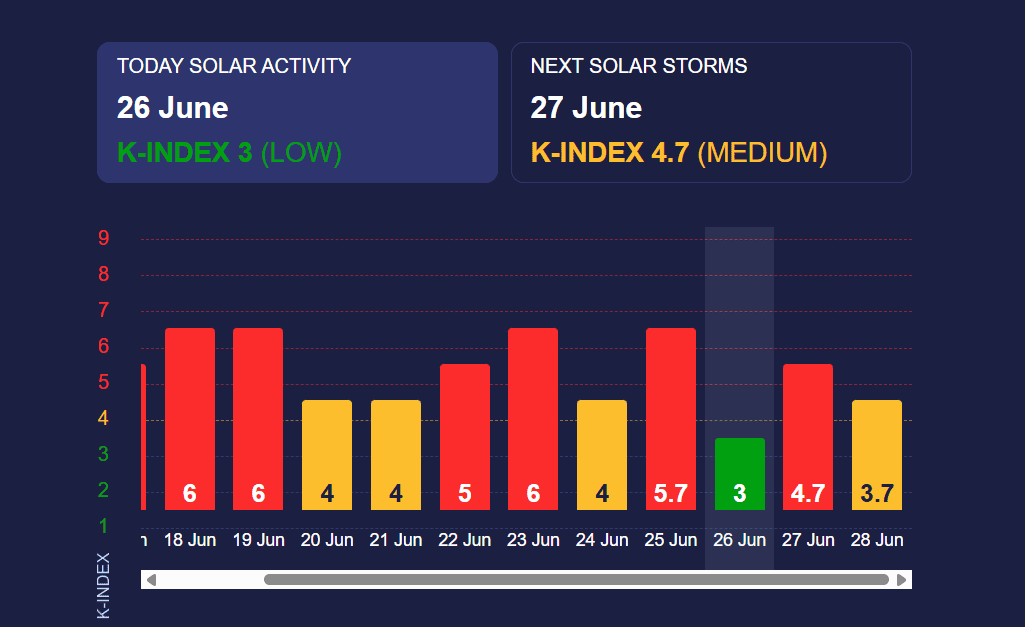 Останнім часом Сонячна активність була доволі мінливою. Фахівці, що стежать за космічною погодою, фіксували як середні, так і потужні магнітні бурі. Протягом останніх 24 годин на Сонці сталося два спалахи класу В та п’ять спалахів класу С. Це безпопосередньо впливає на геомагнітне поле, яке сьогодні коливатиметься від тихого до незначного штормового рівня. Посилення ж до червоного рівня 27 червня є важливим попередженням для населення.