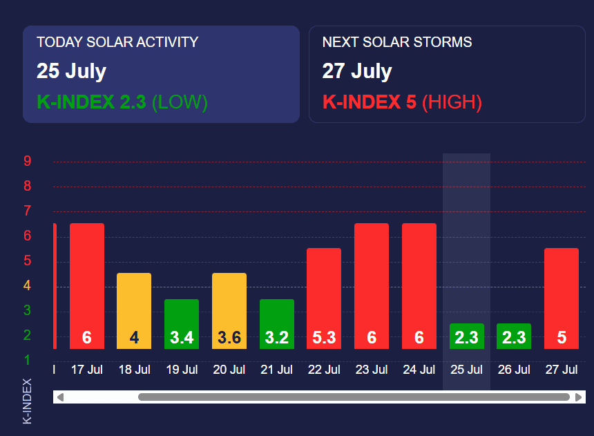 У суботу, 26 липня, магнітна буря очікується на рівні зеленого кольору, з К-індексом 2.3. Це означає, що активність Сонця буде низькою.