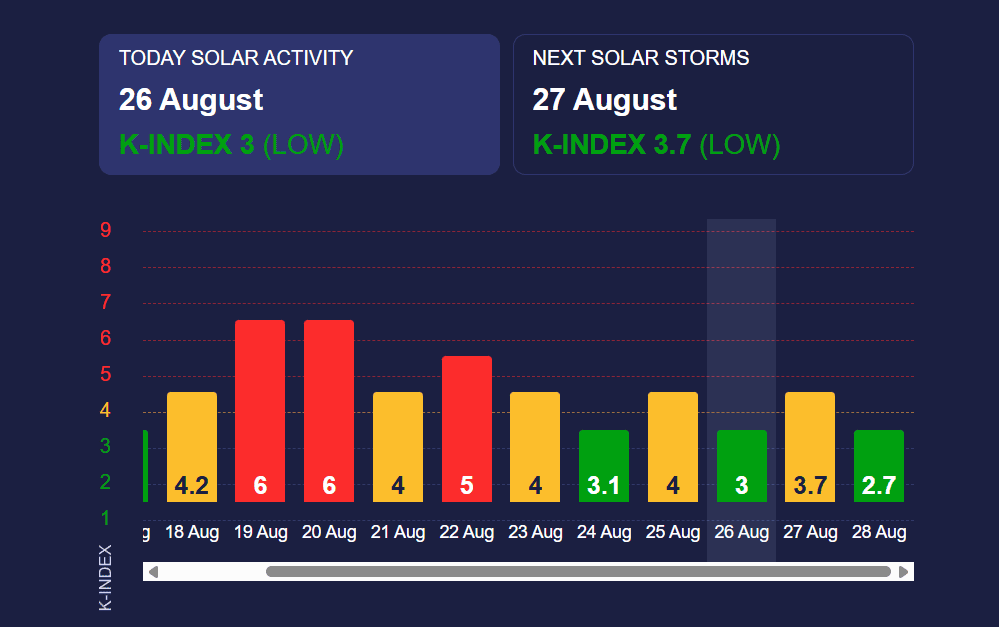 У середу, 27 серпня, прогнозується середня активність Сонця з К-індексом 3.7. Суттєвих магнітних бур не очікується, що свідчить про відносно спокійний період. Ця інформація оновлена ресурс Меteoagent, надаючи актуальні дані про космічну погоду.
