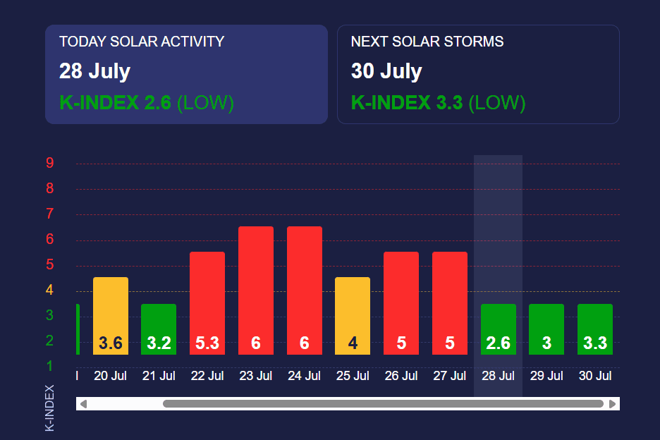У вівторок, 29 липня, **магнітна буря ** буде зеленого рівня – з К-індексом 3. Активність Сонця буде на низькому рівні, що означає мінімальний вплив на Землю.