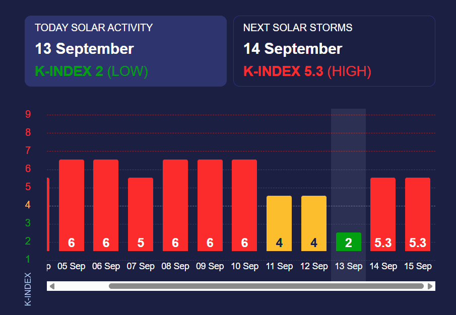 У неділю, 13 вересня, Україну очікує потужна магнітна буря. Активність Сонця зросла і досягне червоного рівня — К-індексу 5.3. Це свідчить про значні космічні процеси, що впливають на Землю.