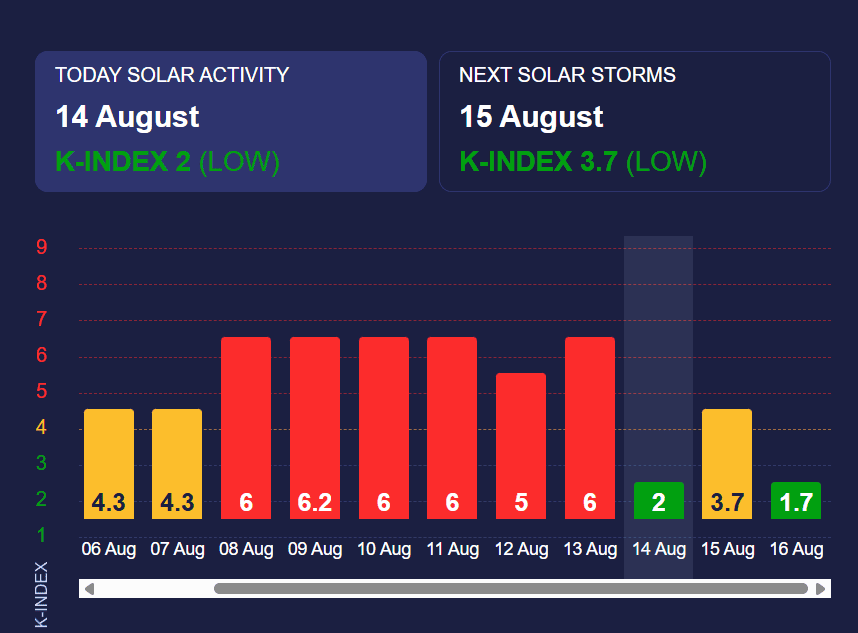 У п’ятницю, 15 серпня, прогнозується низький рівень сонячної активності. Очікується магнітна буря жовтого рівня з К-індексом 3.7. Суттєвих магнітних бур на Землі не передбачається. Останні 24 години сонячна активність була помірною.