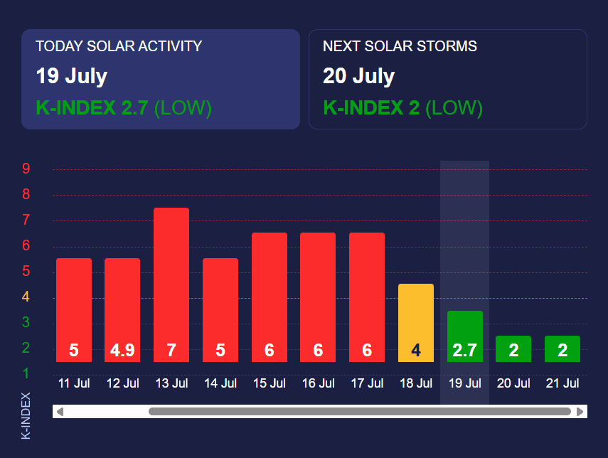 У неділю, 20 липня, магнітна буря досягне зеленого рівня з К-індексом 2. Сонячна активність залишатиметься на низькому рівні, що є сприятливою новиною для метеозалежних людей.