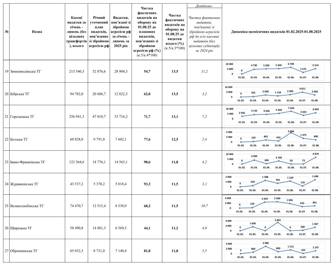 Серед лідерів за часткою фактичних видатків на оборону в загальному обсязі видатків, виключаючи цільові трансферти, відзначаються: Підберізцівська громада з показником 32,5%, Великомостівська – 26,8%, Сокільницька – 24,6%, Розвадівська – 23,3%, та Мурованська – 22%. Ці громади демонструють зразкову відповідальність у розподілі коштів на оборону.
