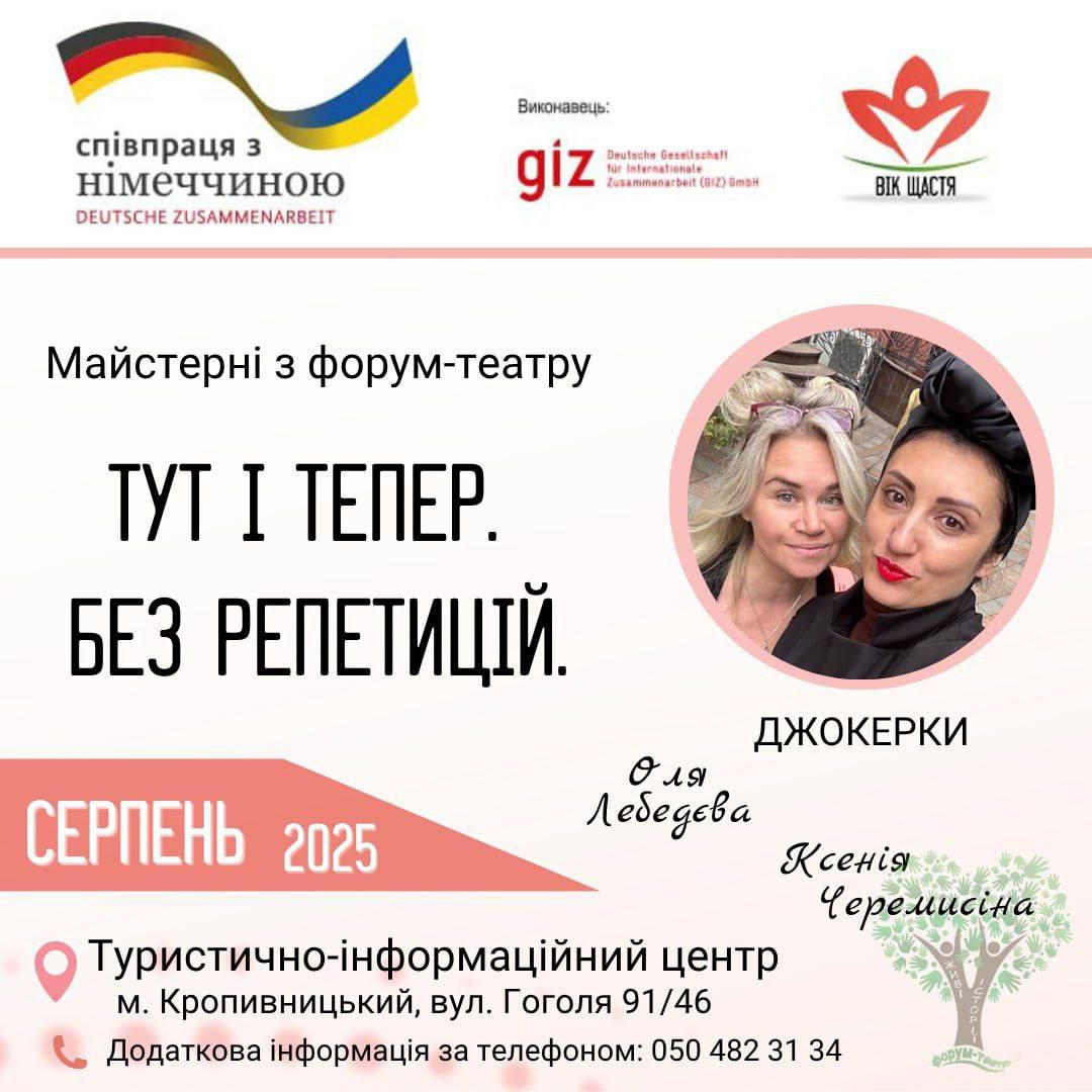 Запрошуємо на унікальні майстерні з форум-театру в Кропивницькому! В межах проєкту «Джерело. Відновлення психологічного ресурсу для родин ветеранів/-ок, ВПО та людей похилого віку», Туристично-інформаційний центр (ТІЦ) організовує короткий, але надзвичайно захоплюючий курс «Майстерні з форум театру: «Тут і тепер. Без репетицій». Це більше, ніж просто театр; це простір для пошуку власного голосу та відвертої розмови про те, що справді важливо. Ми пропонуємо м’яку форму відновлення через гру, дослідження образів, побудову діалогів та отримання нового досвіду. Очікуйте на щирий сміх, можливо, сльози, відчуття підтримки, обійми та несподівані відкриття. Це буде коротка, але насичена сенсами подорож, адже команда підготувала нові вправи, які глибоко торкаються, дивують та резонують з внутрішнім світом кожного учасника.