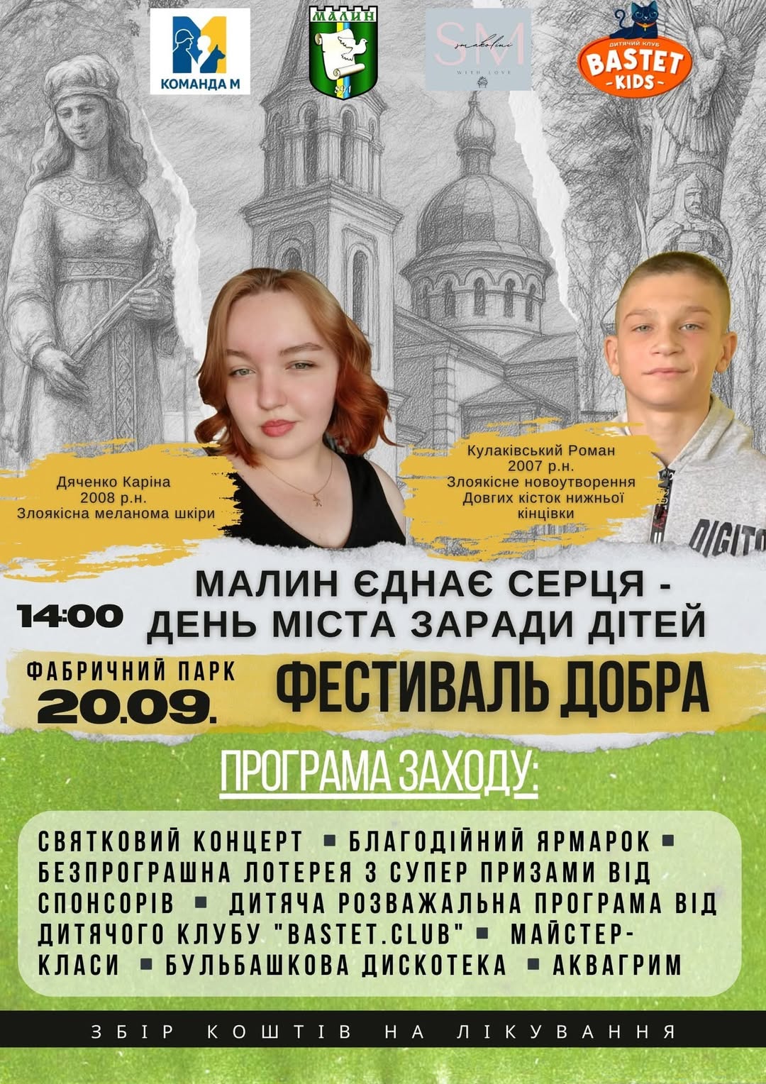 Цього року святкування Дня міста Малин набуває особливого значення, адже воно пройде під гаслом підтримки наших юних мешканців – Дяченко Каріни та Кулаківського Романа. Приєднуйтесь до нас 20 вересня о 14:00 у Фабричному парку сімейного відпочинку 🌳, щоб стати частиною справжнього свята добра.