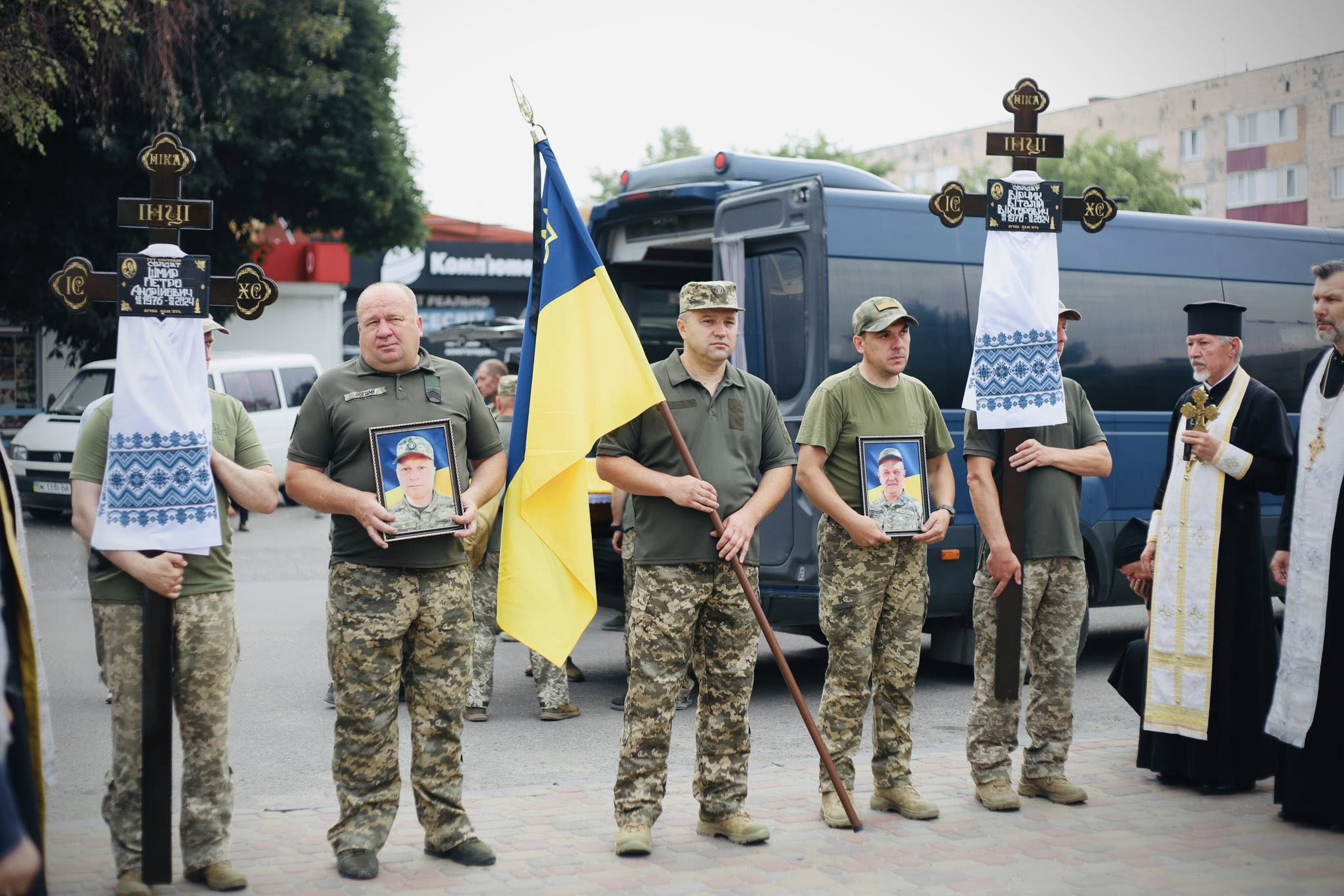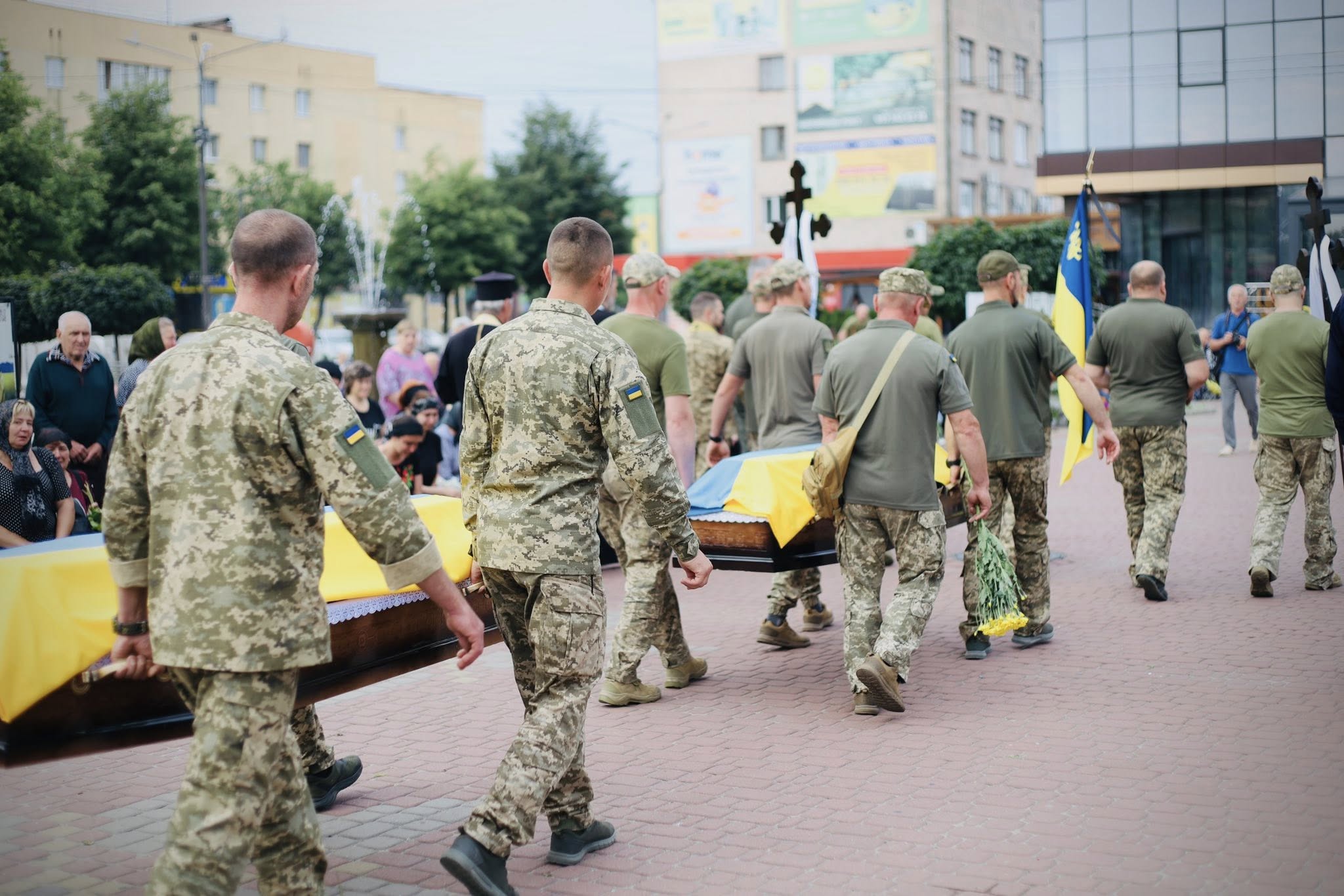 Саме тут громада, побратими, духовенство, представники влади, військові та жителі міста віддали останню шану полеглим Захисникам. У кожному погляді — біль втрати, у кожному серці — глибока вдячність.
