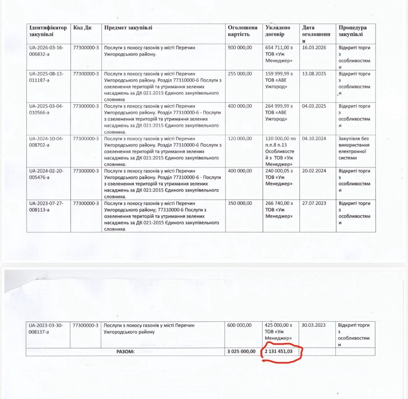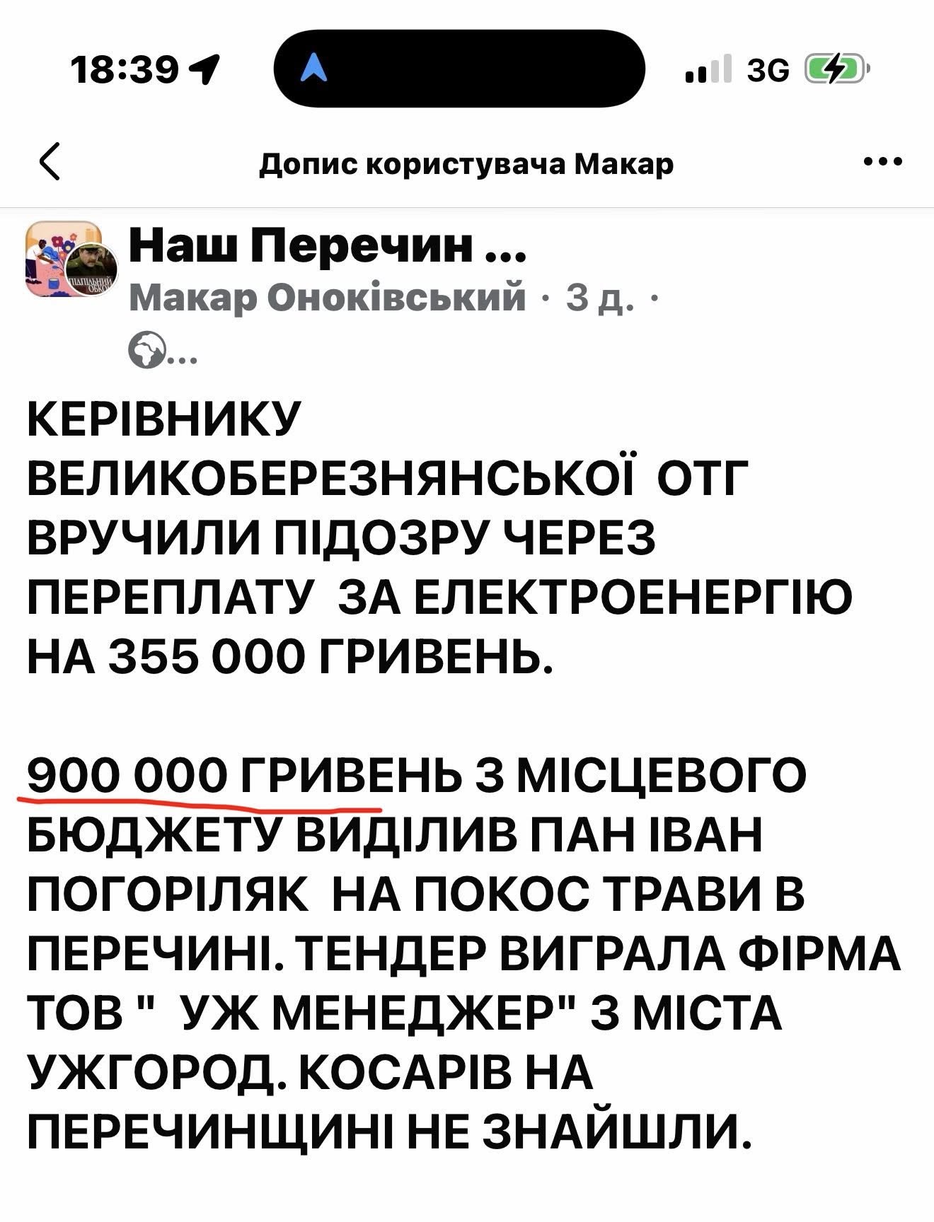 У своєму дописі “Макар Оноківський” стверджує, що Перечинська міська рада за чотири роки нібито сплатила 3 304 421 грн за покіс трави, а кошти були перераховані ужгородській фірмі ТОВ “УЖ МЕНЕДЖЕР”.