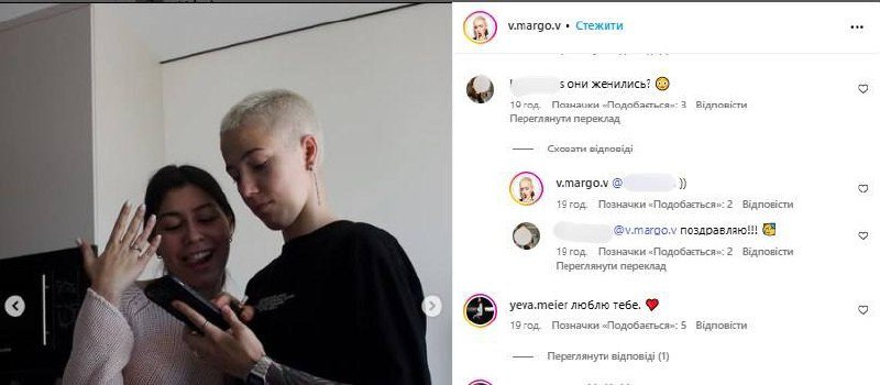 Уважні підписники помітили на фото каблучку на руці Єви, що спровокувало розмови про можливі заручини. Марго Верховцева підтвердила ці припущення позитивним жестом у коментарях, додавши смайлик-усмішку. Ця новина викликала хвилю підтримки та привітань від шанувальників та друзів пари. Відкритість Марго Верховцевої щодо своїх стосунків робить її прикладом для багатьох, хто вагається зробити камінг-аут.