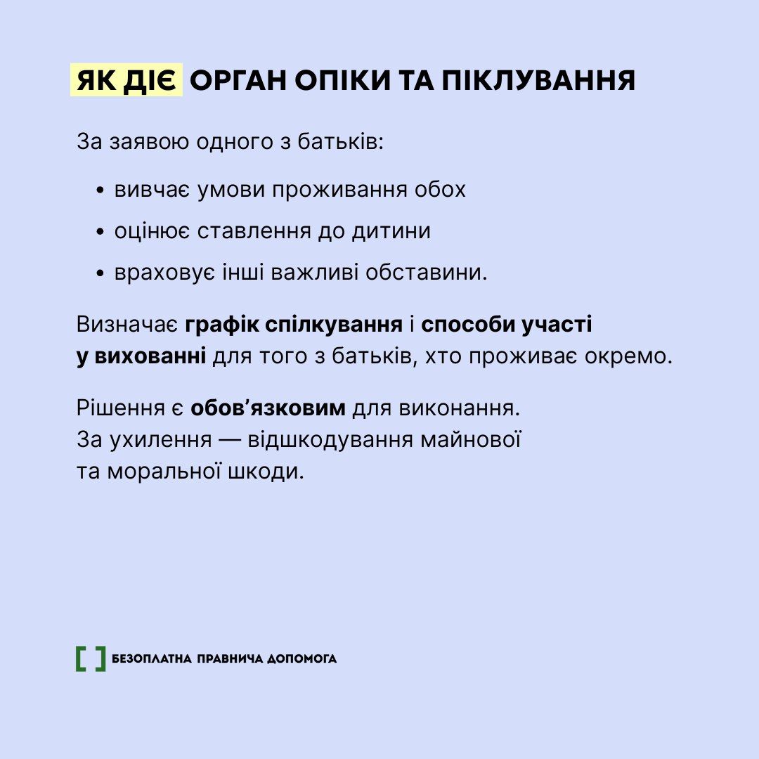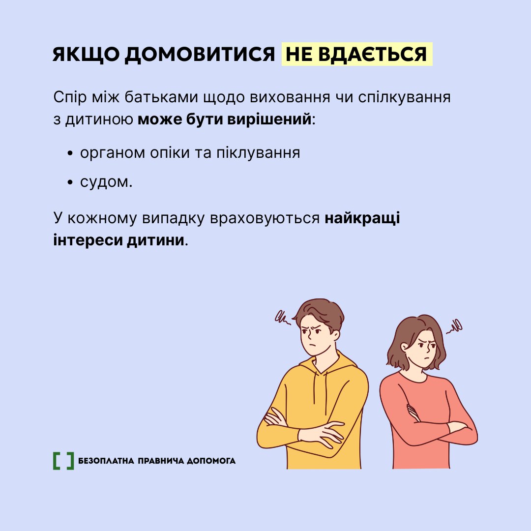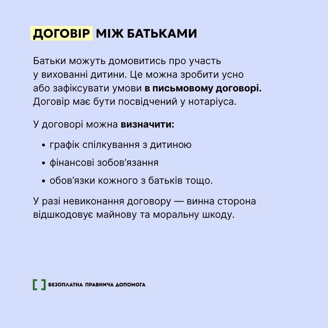 🟩 **Права батьків на дитину**: Мати і батько мають абсолютно рівні права та обов’язки щодо їхньої дитини, незалежно від офіційного шлюбу. Розлучення жодним чином не впливає на права батьків на дитину. Дитина, як і раніше, залишається їхньою спільною дитиною, а її виховання – їхнім спільним обов’язком. Батько чи мати, які проживають окремо, мають повне право брати активну участь у вихованні дитини та підтримувати з нею спілкування. Інший з батьків не має права перешкоджати цьому спілкуванню, якщо воно не становить загрози для дитини. Усі спірні питання, які можуть виникнути у процесі виховання дитини, вирішуються згідно з чинним законодавством України.