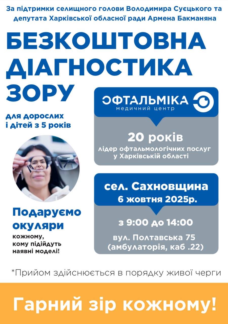 Чудові новини для мешканців Сахновщинської громади! Медичний центр «Офтальміка» запрошує всіх охочих на безкоштовне обстеження зору.