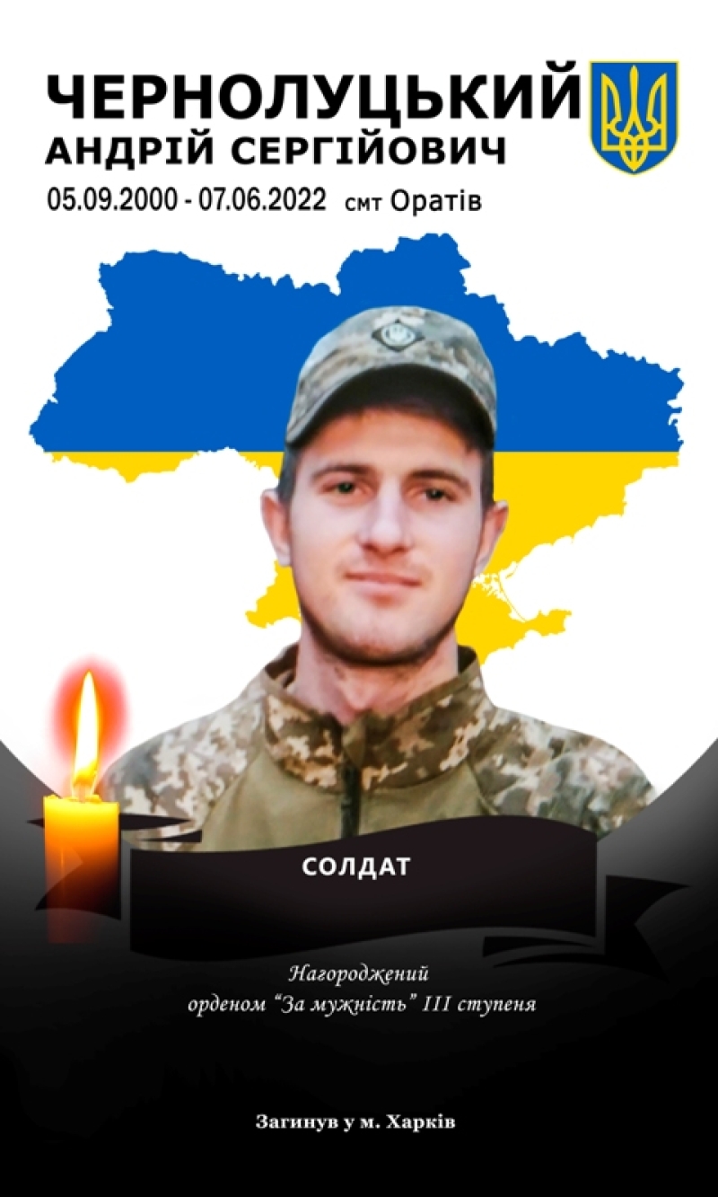Саме цього дня минають роковини загибелі наших Героїв-земляків. Третя річниця, як став у Небесний стрій ЧЕРНОЛУЦЬКИЙ Андрій Сергійович (05.09.2000-07.06.2022) із селища Оратів. Андрій Чернолуцький народився у с. Жуківці на Жмеринщині. З 2013 року проживав у селищі Оратів під опікою прийомних батьків Світлани Василівни і Василя Івановича Журавлів. Андрій був надзвичайно доброю і світлою дитиною, мав багато друзів і любив тварин. Він добровільно пішов на контрактну службу у ЗСУ, брав участь в ООС. У лютому 2022 року проходив навчання на Яворівському полігоні, а 15 березня повернувся у м.Первомайськ. 7 червня 2022 року серце бійця зупинилося на 22 році життя. Героїзм Андрія Чернолуцького відзначено державною нагородою посмертно. Вічна пам’ять Герою!