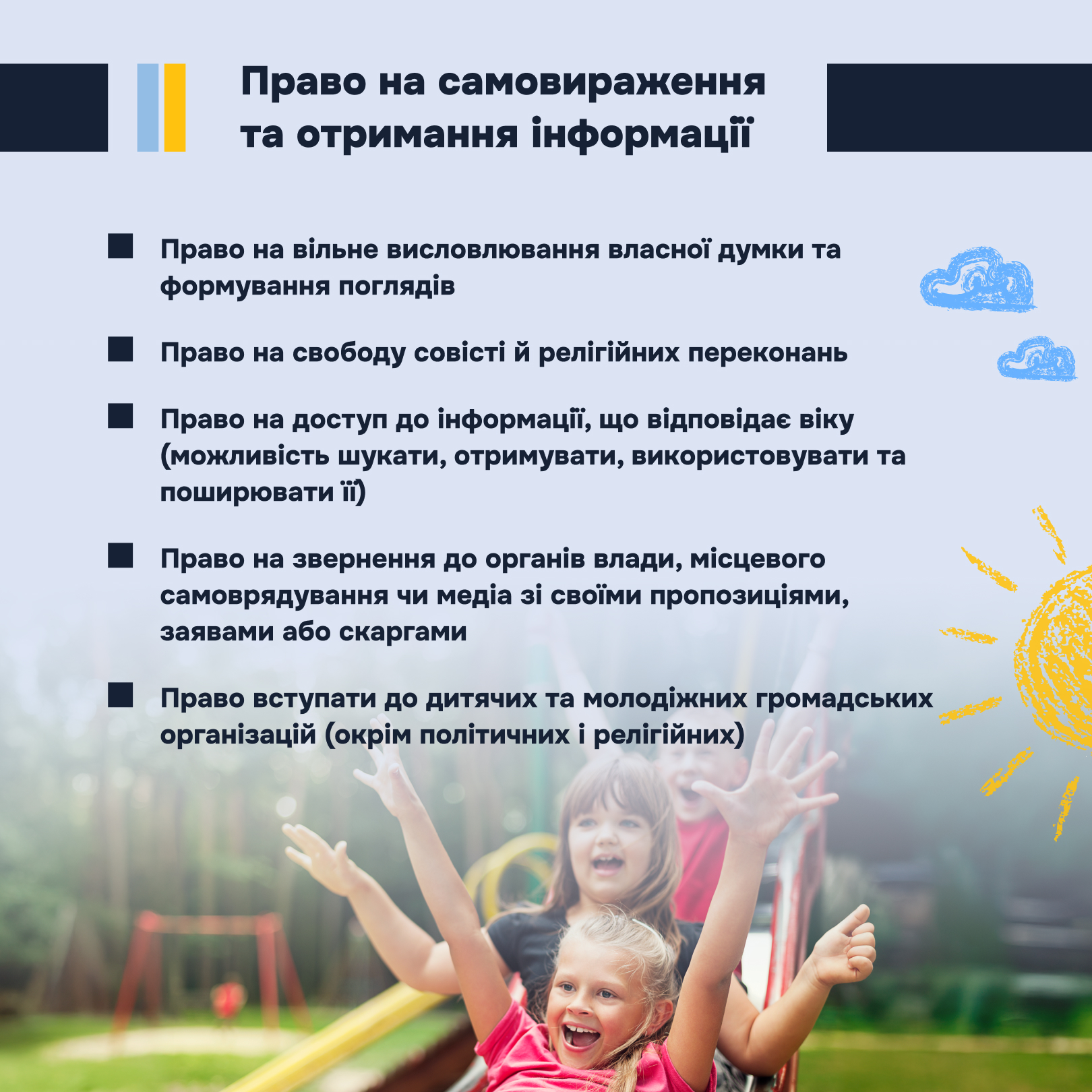 Українське законодавство, спираючись на міжнародні стандарти, гарантує дітям право на життя, на всебічний розвиток, на захист від насильства та дискримінації, а також на висловлення власної думки. Кожна дитина має право на освіту, медичну допомогу та вільний доступ до інформації. Важливо, щоб ці права не лише декларувалися, але й реально забезпечувалися на практиці, створюючи безпечне та сприятливе середовище для зростання та розвитку майбутніх поколінь. Посилення обізнаності щодо прав дітей є одним із пріоритетних напрямків державної політики, спрямованої на побудову справедливого та правового суспільства. Розуміння прав дітей сприяє формуванню відповідального ставлення до їхнього добробуту та захисту.