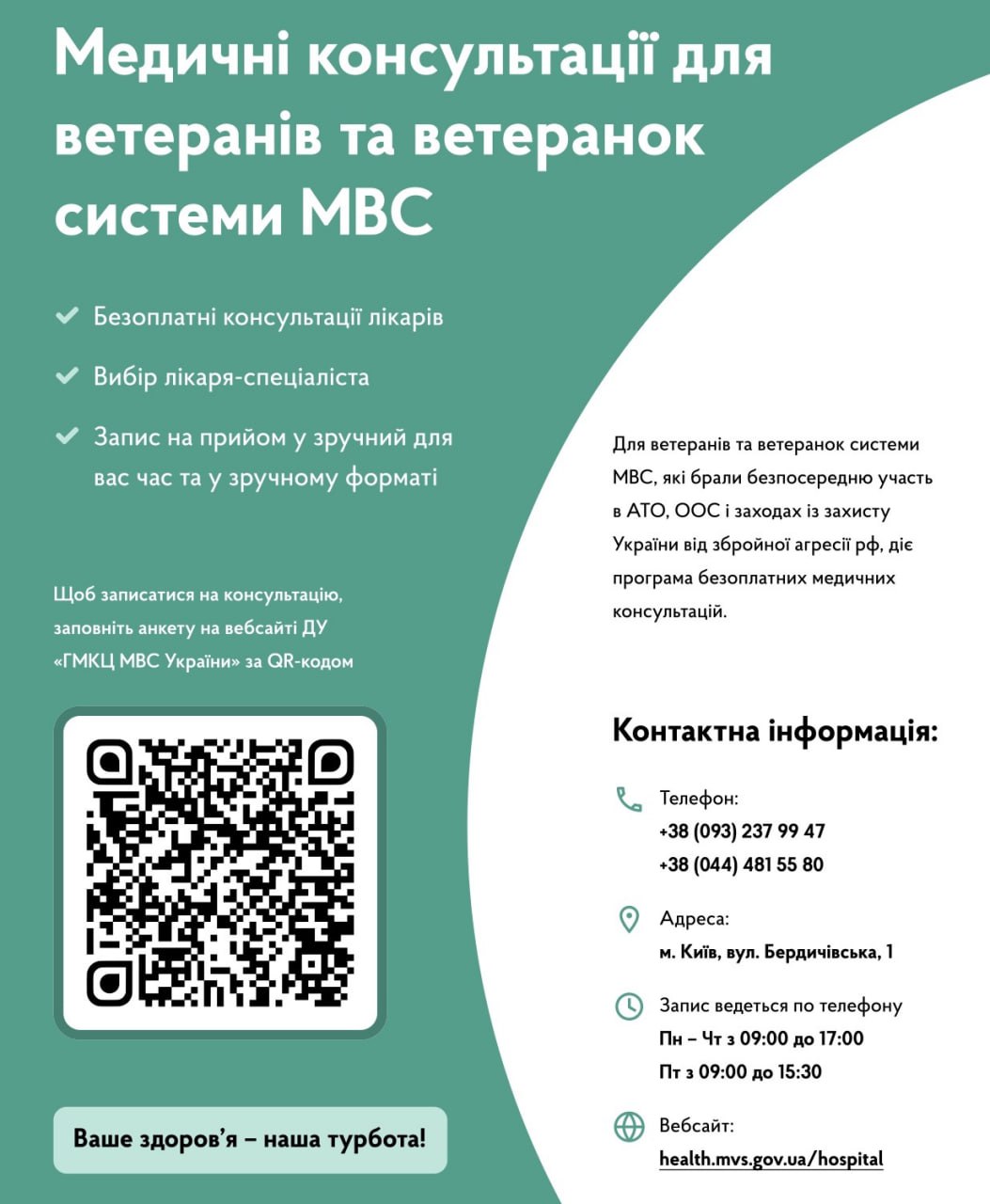 Забезпечення якісної медичної допомоги для ветеранів та ветеранок системи Міністерства внутрішніх справ України є пріоритетним завданням. Ця програма надає можливість отримати безоплатні медичні консультації для всіх, хто був звільнений зі служби та брав активну участь у бойових діях, зокрема в АТО, ООС, а також у заходах із захисту суверенітету та територіальної цілісності України від збройної агресії Російської Федерації.