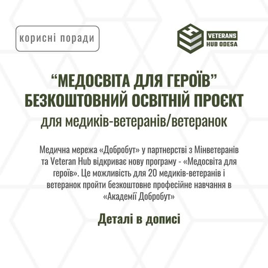 Медична мережа “Добробут” спільно з Міністерством у справах ветеранів та Veteran Hub запускає унікальну освітню ініціативу «Медосвіта для героїв». Ця програма надає ексклюзивну можливість 20 медичним працівникам-ветеранам пройти безкоштовне професійне навчання в авторитетній «Академії Добробут».