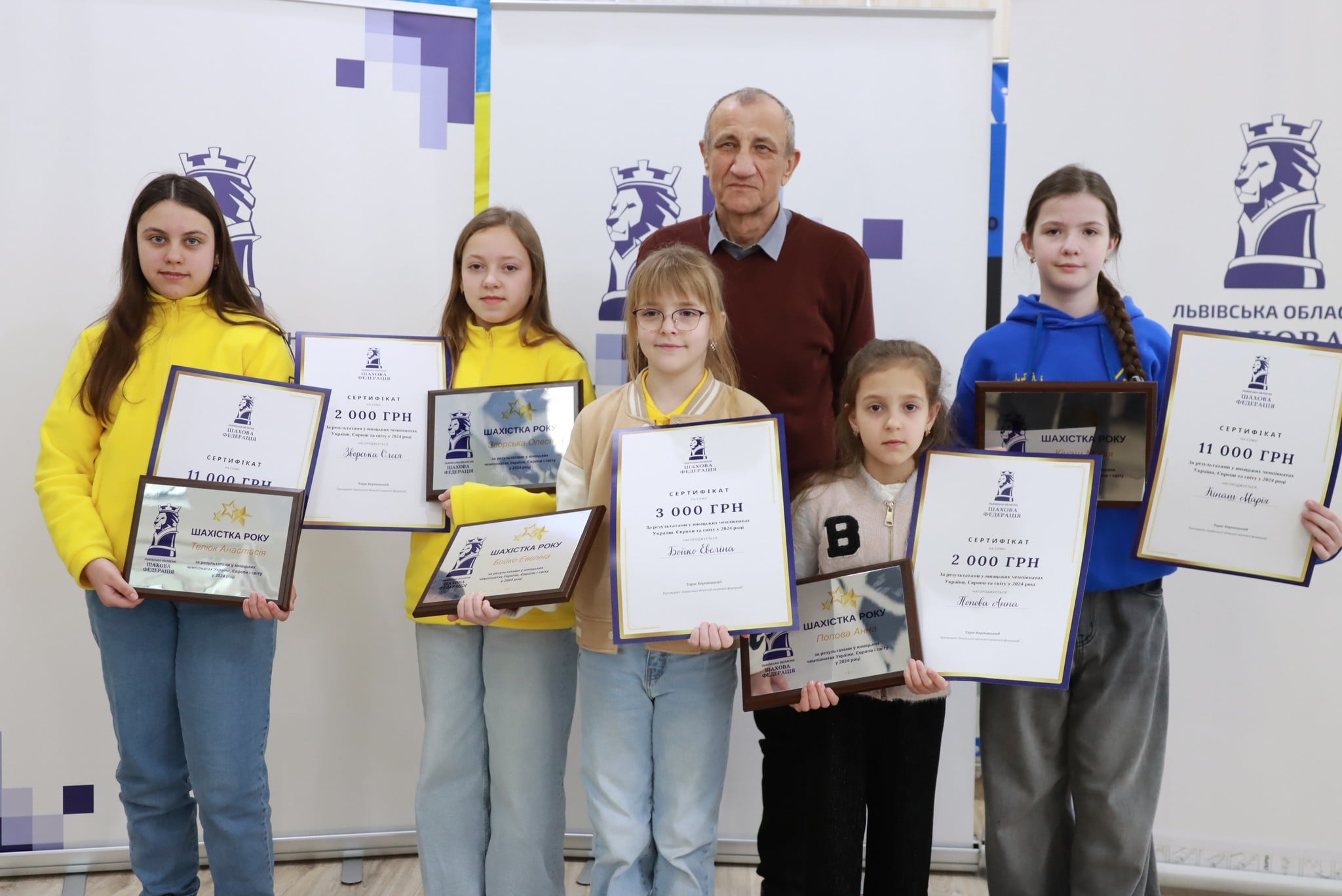 На іншому знімку Микола Іванович Матвієнко зображений разом із п’ятьма вихованками, які минулого року вибороли високі нагороди на чемпіонатах України. Ці досягнення підкреслюють не лише індивідуальні успіхи юних шахістів, а й значний потенціал та ефективність методики, яку застосовує тренер Матвієнко. Такі результати надихають і показують, наскільки важливою є роль наставника у становленні спортивного таланту.