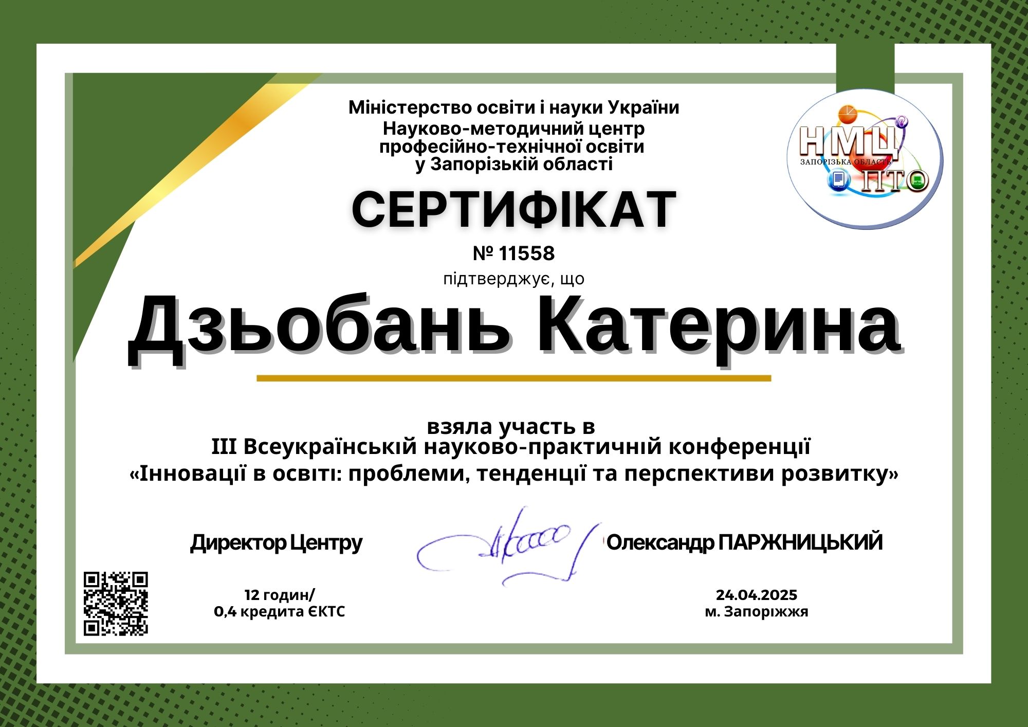 Ми заохочуємо наших педагогів до участі в науково-практичних конференціях, адже це чудовий спосіб для професійного розвитку та обміну досвідом. Підтримка методиста Катерини Дзьобань робить цей процес ще більш ефективним та результативним.